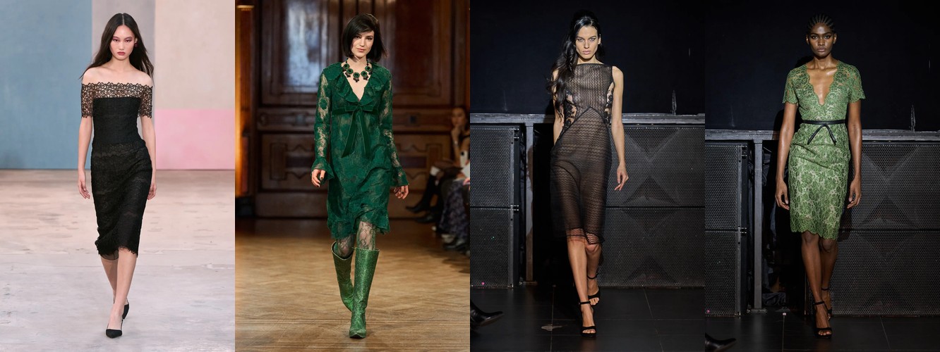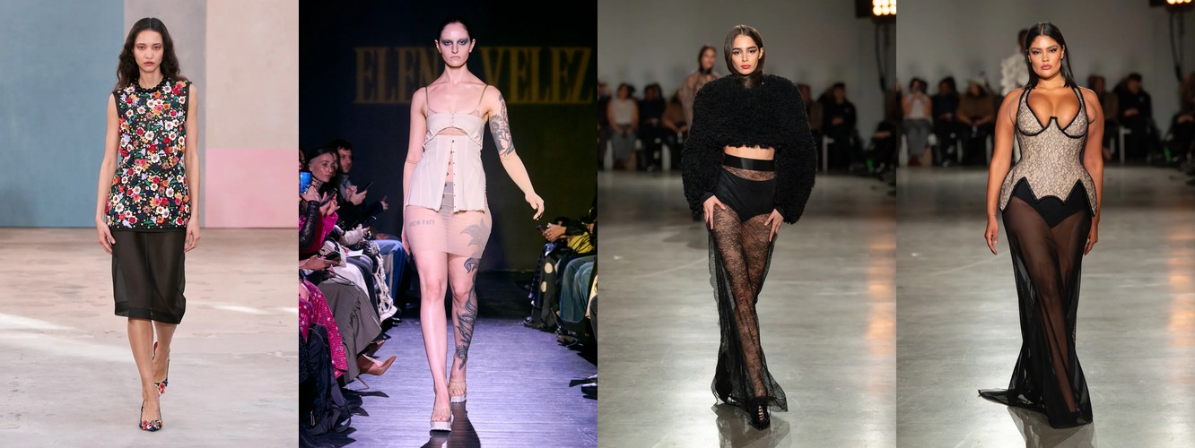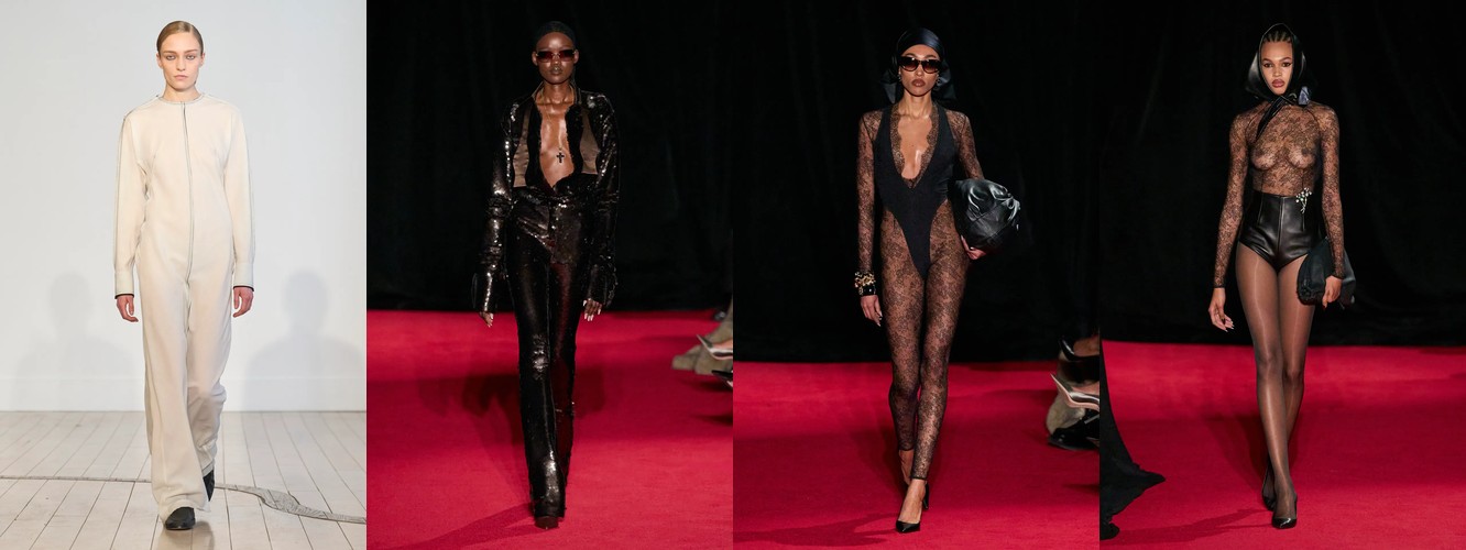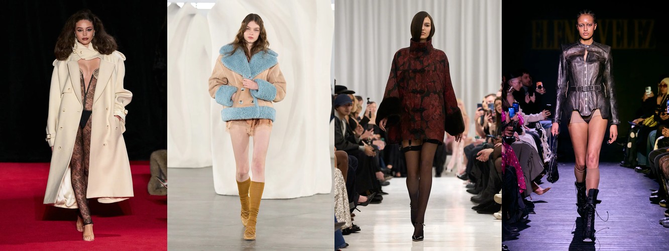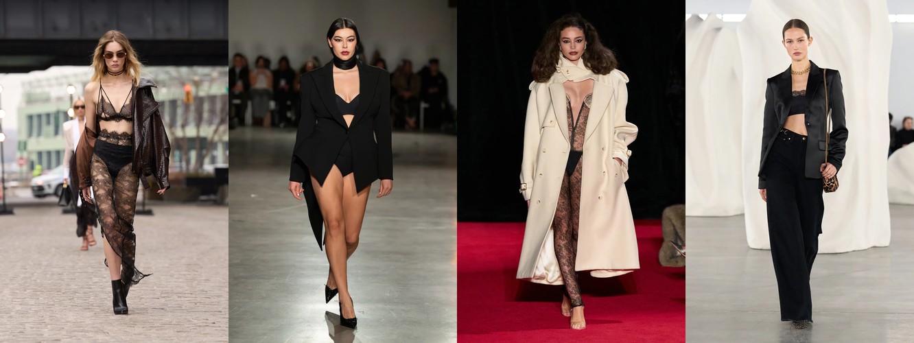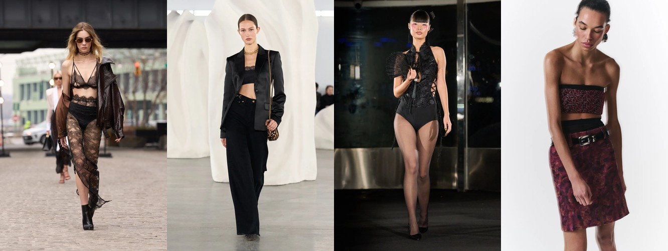 Одним из наиболее значимых «тихих сигналов» сезона является кластер атрибутов, связанных с бельевой эстетикой и обнажённостью. Прозрачный материал растёт на 145,69% (с 1,16% до 2,85%), а охват брендов почти удваивается — с 24% до 43%. Топ из кружевного белья/камисоль — +115,69%. Сетка — +106,25%. Слип-платье — +153,85%. Колготки как видимый элемент стайлинга — +228,89%. Сетчатые колготки — +192,31%. Боди — +276,92% (с минимальной базы, но с тройным ростом охвата). Бюстгальтер как элемент образа стабилен. Шнуровка — +106,25%.