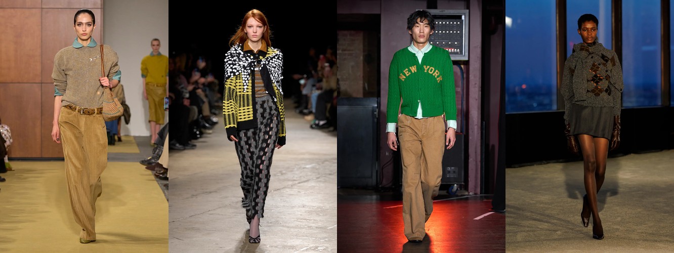 Данные фиксируют масштабную переоценку материалов. Группа «интеллектуальных» и «рациональных» фактур системно теряет позиции: твид обваливается на 30,25% доли луков при катастрофическом сокращении охвата с 82% до 59% (–28,05%); трикотаж в целом — минус 16,94% доли и минус 23,16% охвата; вязаные брюки теряют 21,75% доли при обвале охвата с 66% до 41% (–37,88%). Арановая вязка — минус 34,81%. Ребристая вязка — минус 14,58%. Свитер — минус 15,49%.