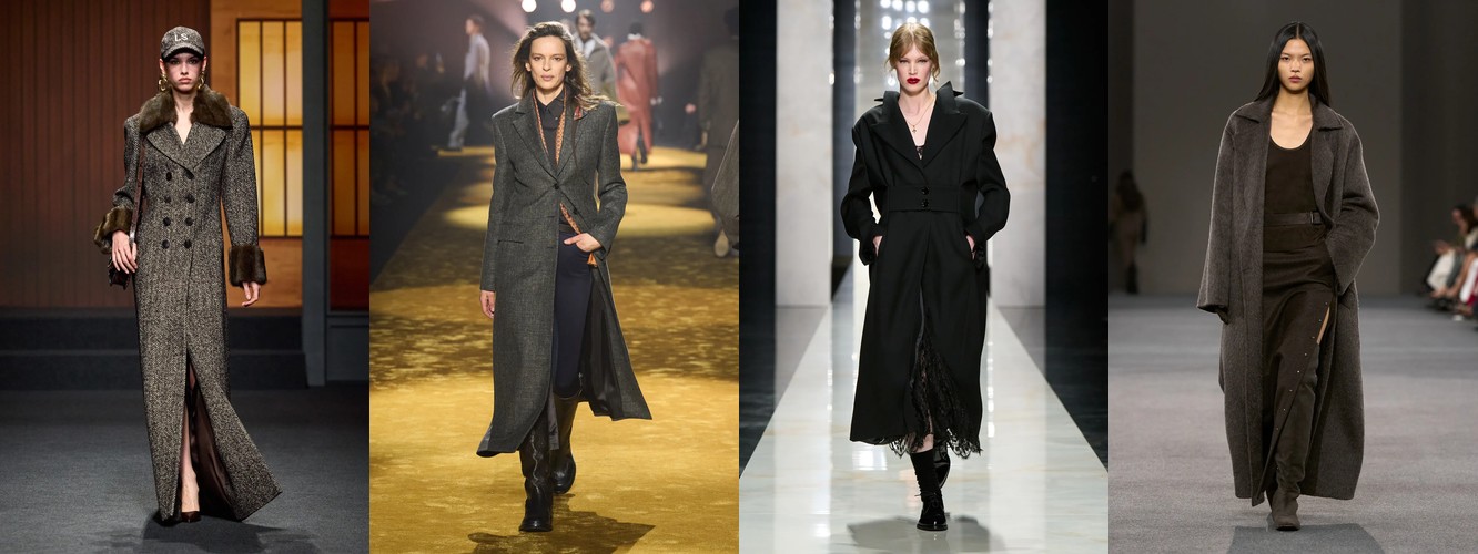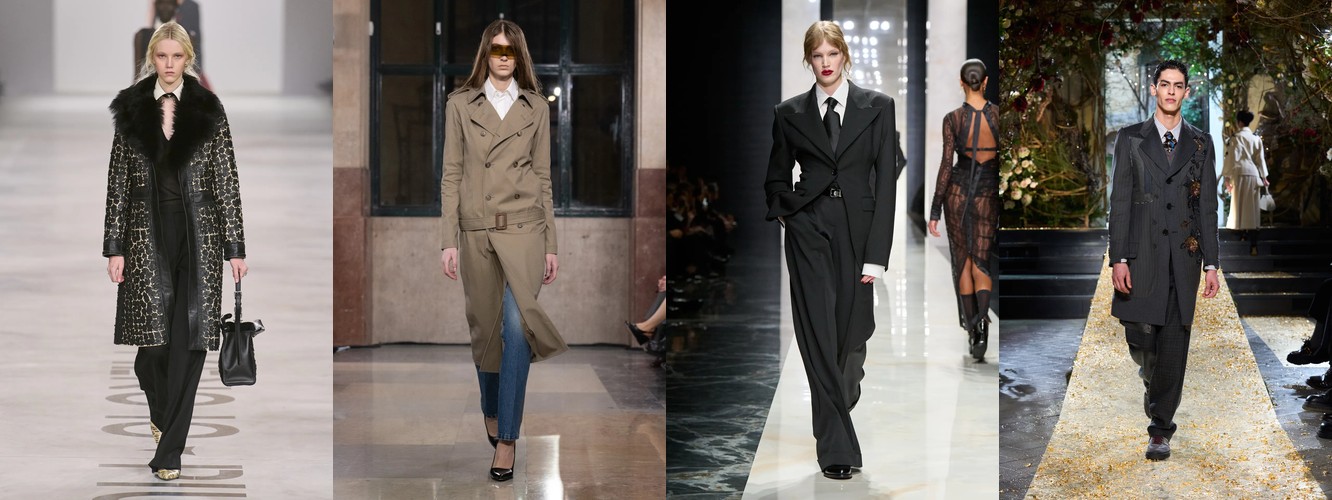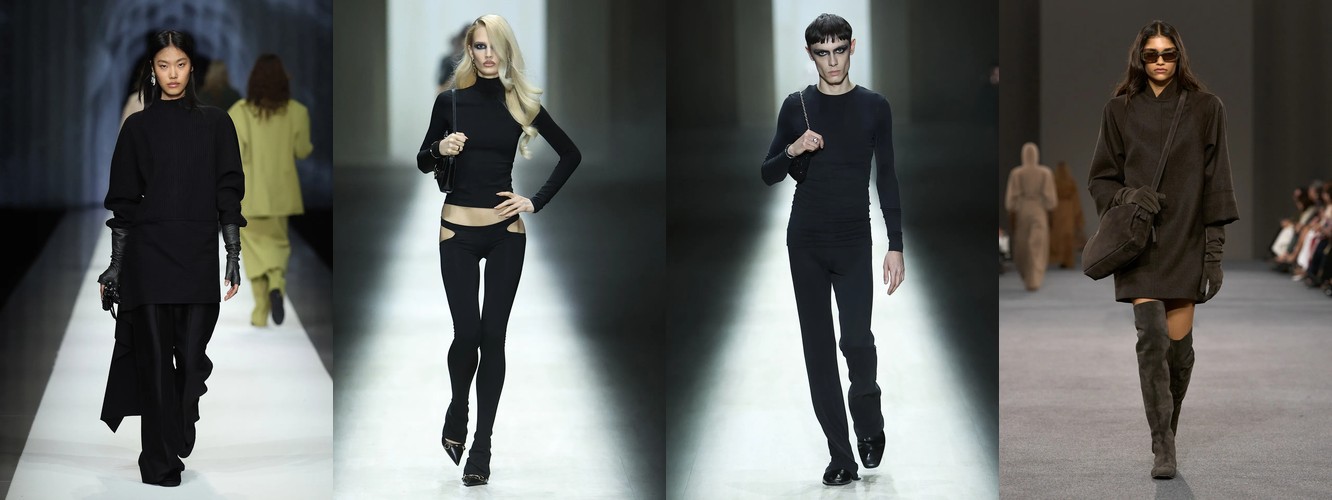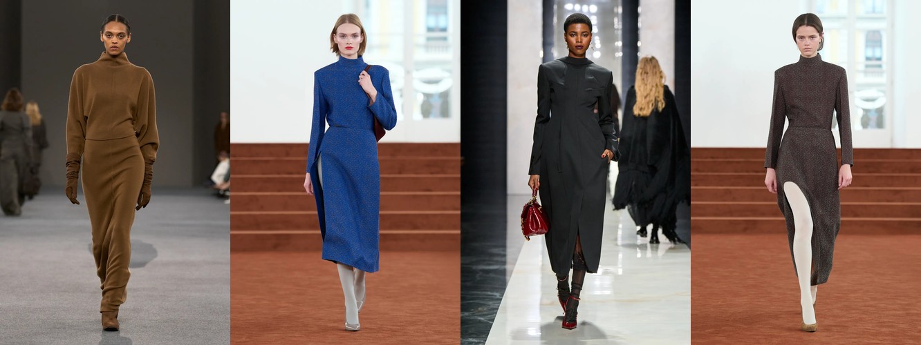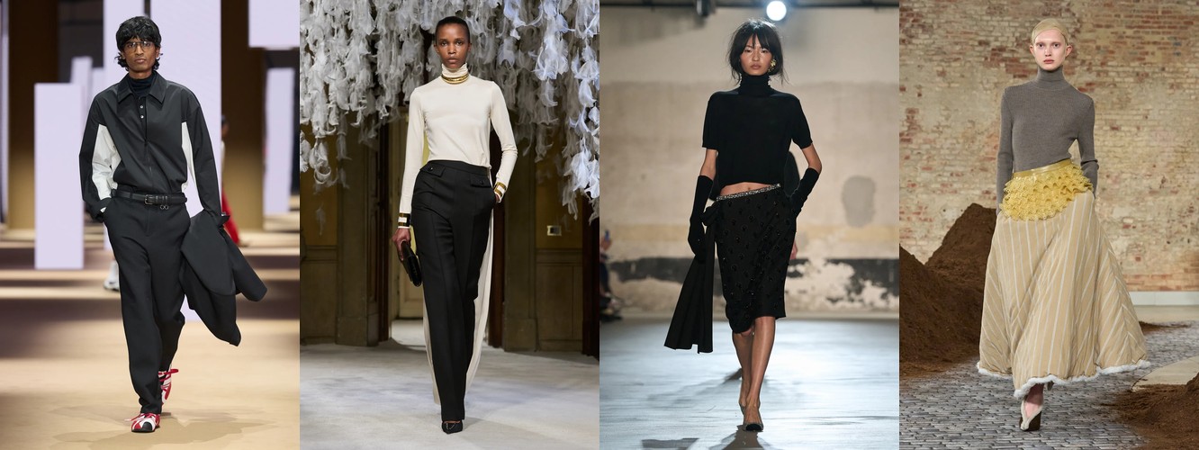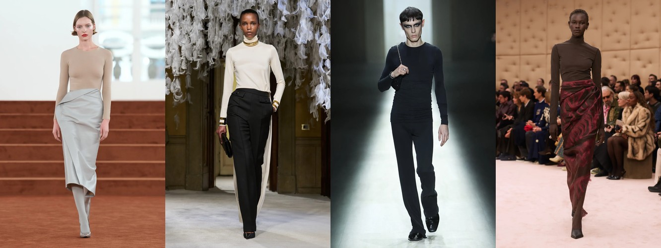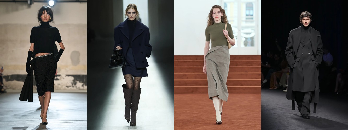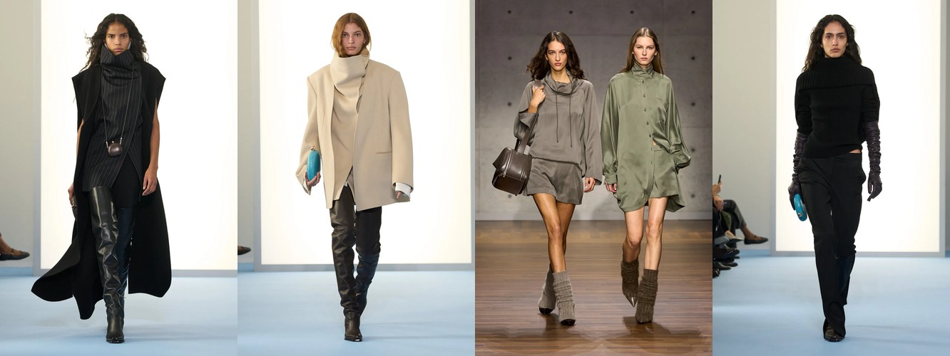 Женщина AW26-27, напротив, — архитектор собственного пространства. Она предпочитает конструкцию — украшению, вертикаль — горизонтали, монохром — полихромии. Её базовые инструменты — костюм-тройка, длинное пальто, очень длинные брюки, блейзер, водолазка. Она закрывает тело не из скромности, а из стратегического контроля над восприятием: высокий воротник, удлинённый силуэт, отсутствие орнамента создают эффект неприступности, который в новой семантике равен авторитету.