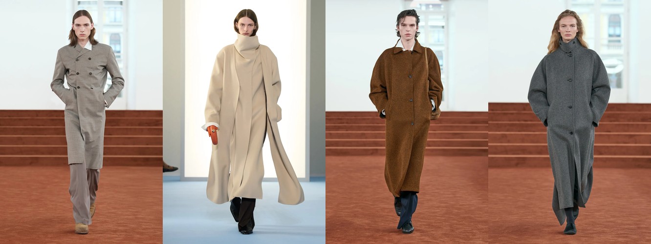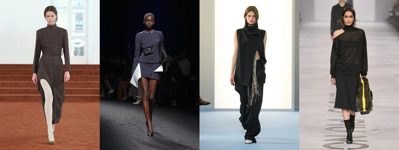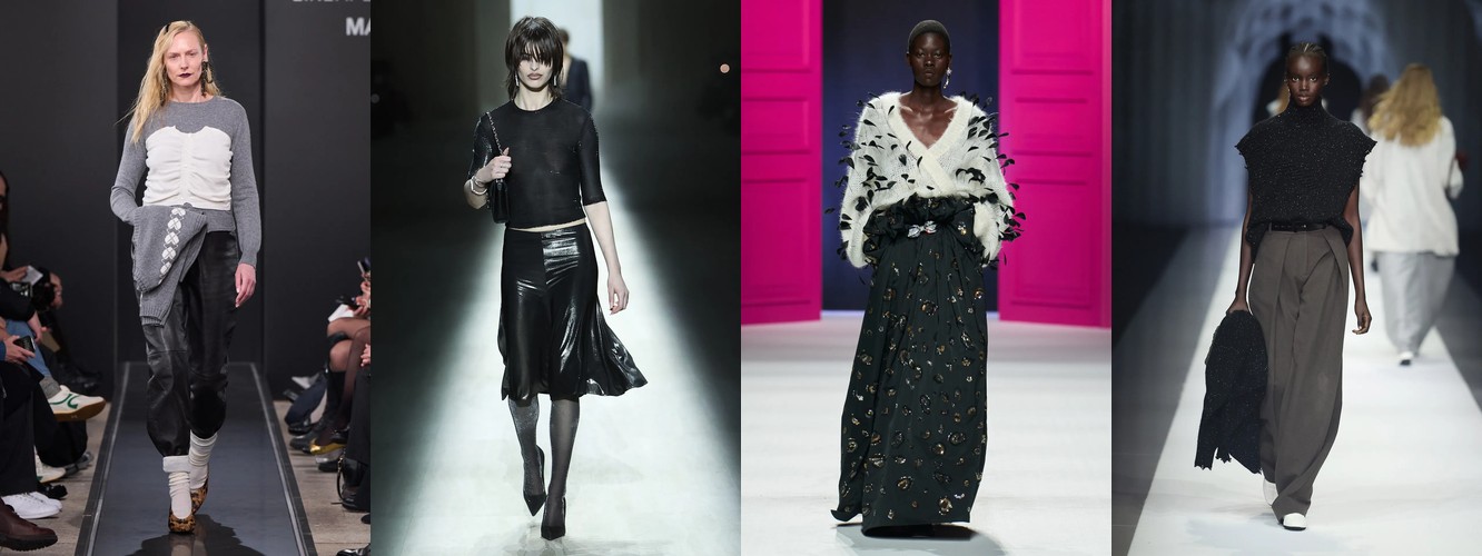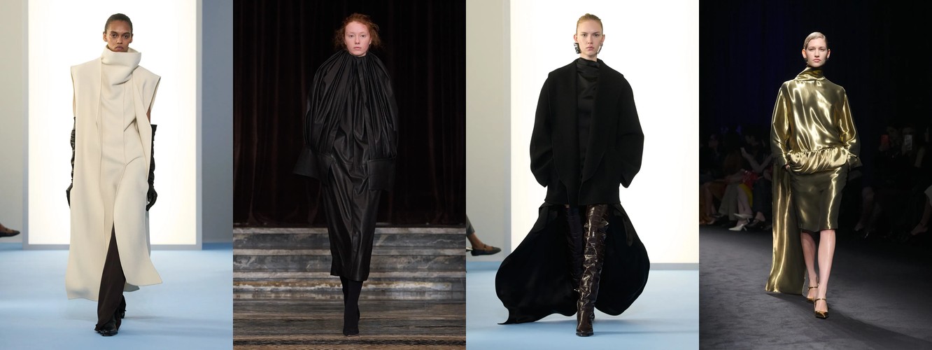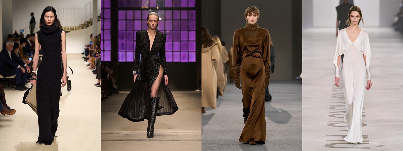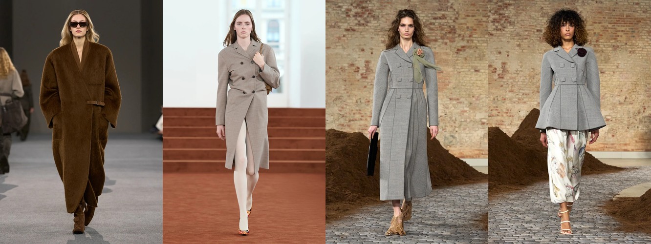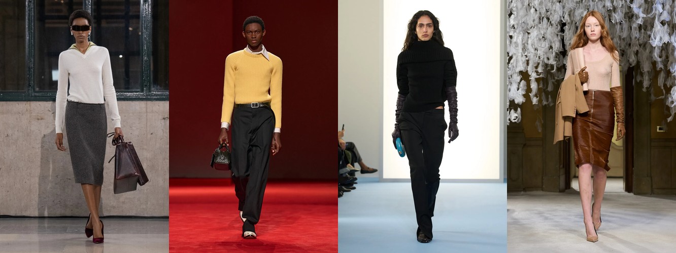 Женщина AW26-27, напротив, — архитектор собственного пространства. Она предпочитает конструкцию — украшению, вертикаль — горизонтали, монохром — полихромии. Её базовые инструменты — костюм-тройка, длинное пальто, очень длинные брюки, блейзер, водолазка. Она закрывает тело не из скромности, а из стратегического контроля над восприятием: высокий воротник, удлинённый силуэт, отсутствие орнамента создают эффект неприступности, который в новой семантике равен авторитету.