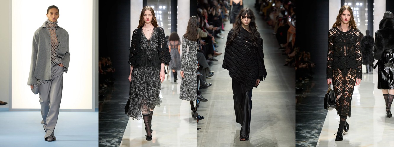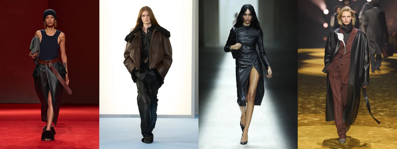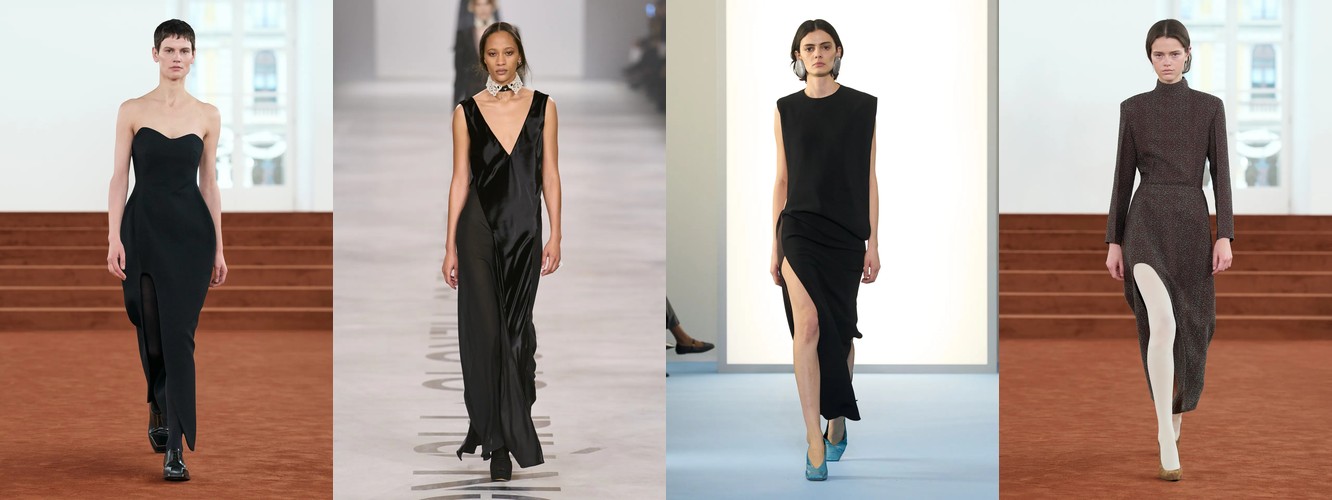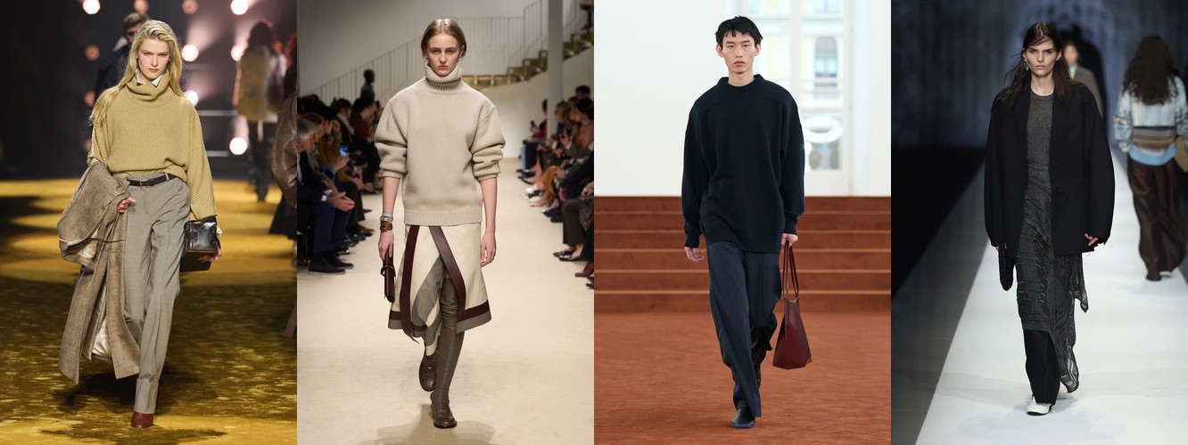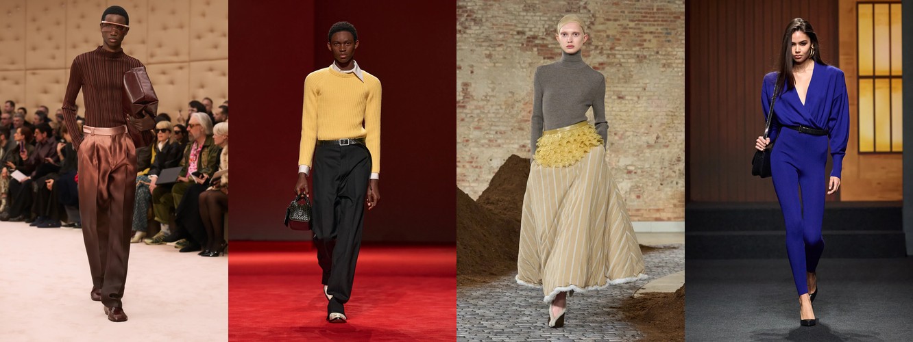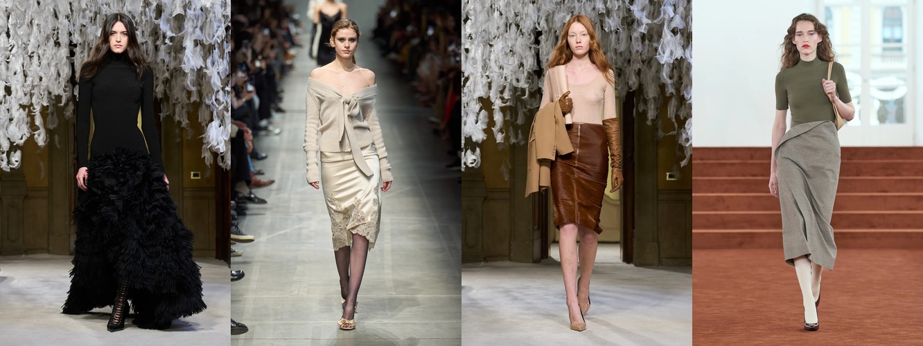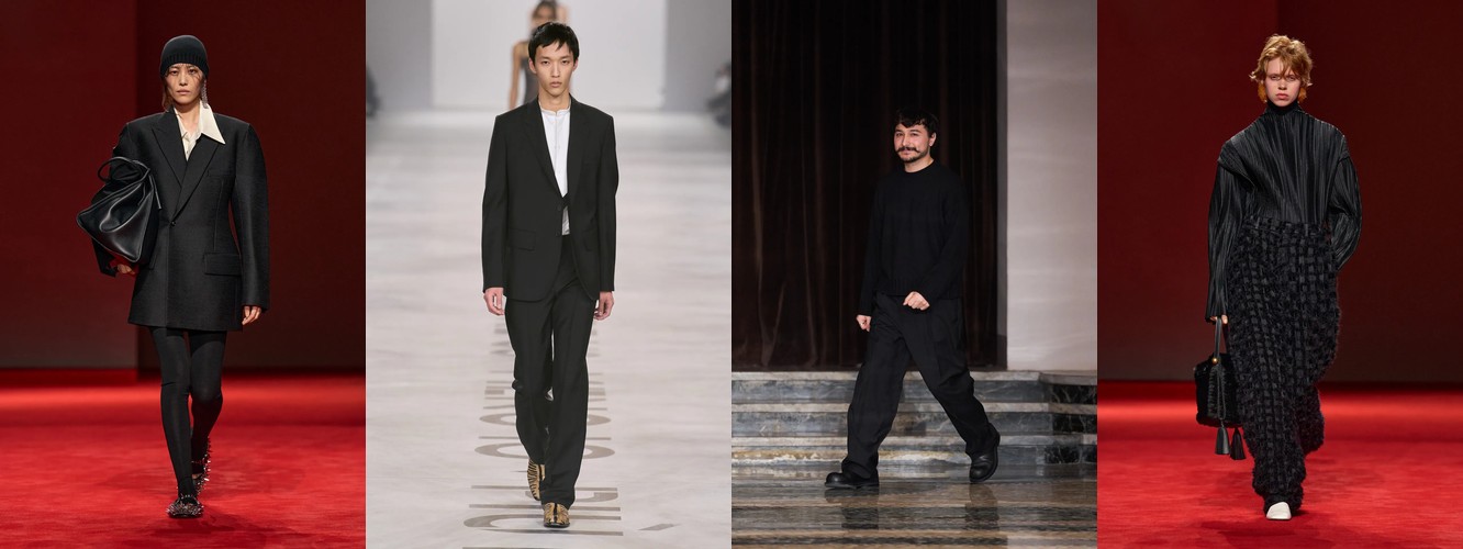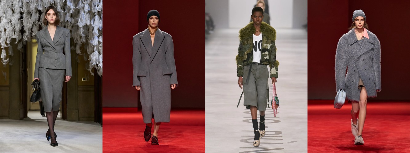 Женщина AW26-27, напротив, — архитектор собственного пространства. Она предпочитает конструкцию — украшению, вертикаль — горизонтали, монохром — полихромии. Её базовые инструменты — костюм-тройка, длинное пальто, очень длинные брюки, блейзер, водолазка. Она закрывает тело не из скромности, а из стратегического контроля над восприятием: высокий воротник, удлинённый силуэт, отсутствие орнамента создают эффект неприступности, который в новой семантике равен авторитету.