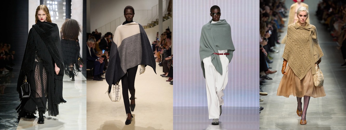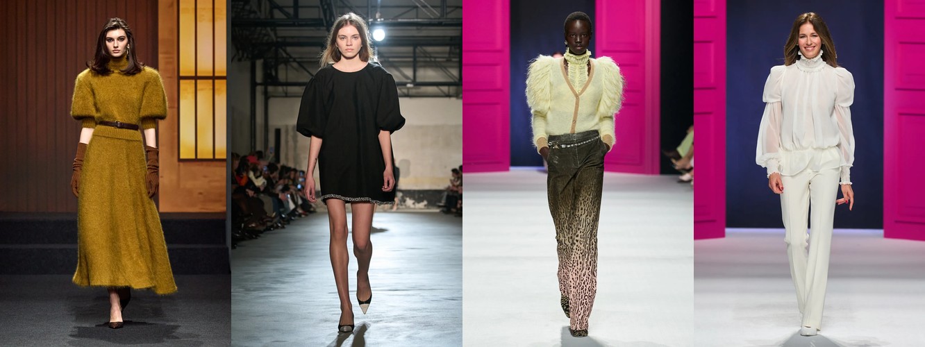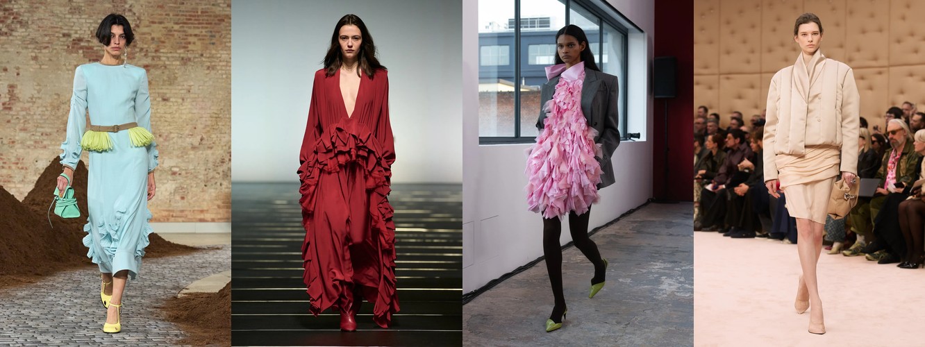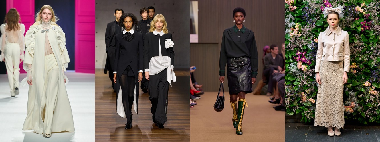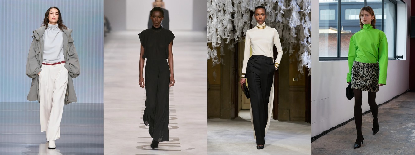 Закрытые горловины и воротники формируют самостоятельный микро-тренд: воротник (+19,81%, охват вырос с 82% до 92%), высокий воротник (+28,82%), водолазка (+47,14%), воротник-воронка (+11,61%), платье с высокой горловиной (+65,43%), оборки на воротнике (+13,04% при росте охвата с 32% до 57%). Шея и грудь закрываются — зона декольте уступает зоне воротника как ключевому месту визуального акцента. Это одновременно и защитный жест, и жест власти (ассоциация с военной формой, церемониальной одеждой, клерикальным облачением).