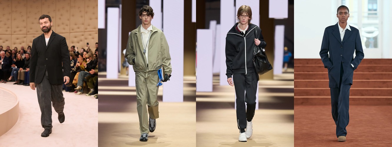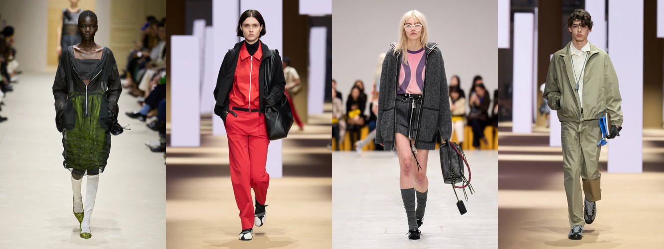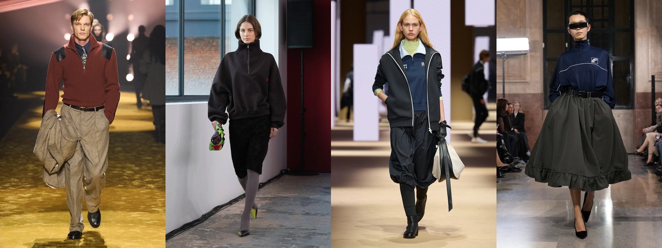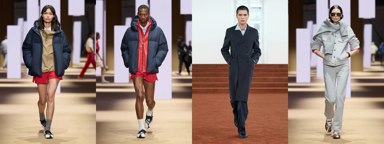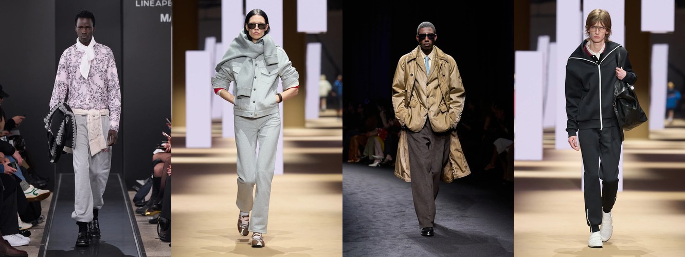 Спортивный код демонстрирует взрывной рост: атрибут «спортивный» — +315,15% (с 0,33% до 1,37%), спортивная куртка — +147,79%, спортивные штаны — +61,03%, джоггеры стабильны. При этом охват «спортивного» вырос с 10% до 22% брендов — речь не об отдельном доме, а о зарождающемся консенсусе. Парижский подиум, традиционно антагонистичный к athleisure, начинает интегрировать спортивный код в систему tailoring, создавая гибридные силуэты. Это прямой отклик на макро-тренд wellness-ориентированного лайфстайла и ответ на успех Miu Miu-подобной инфильтрации спортивного в люксовое.
