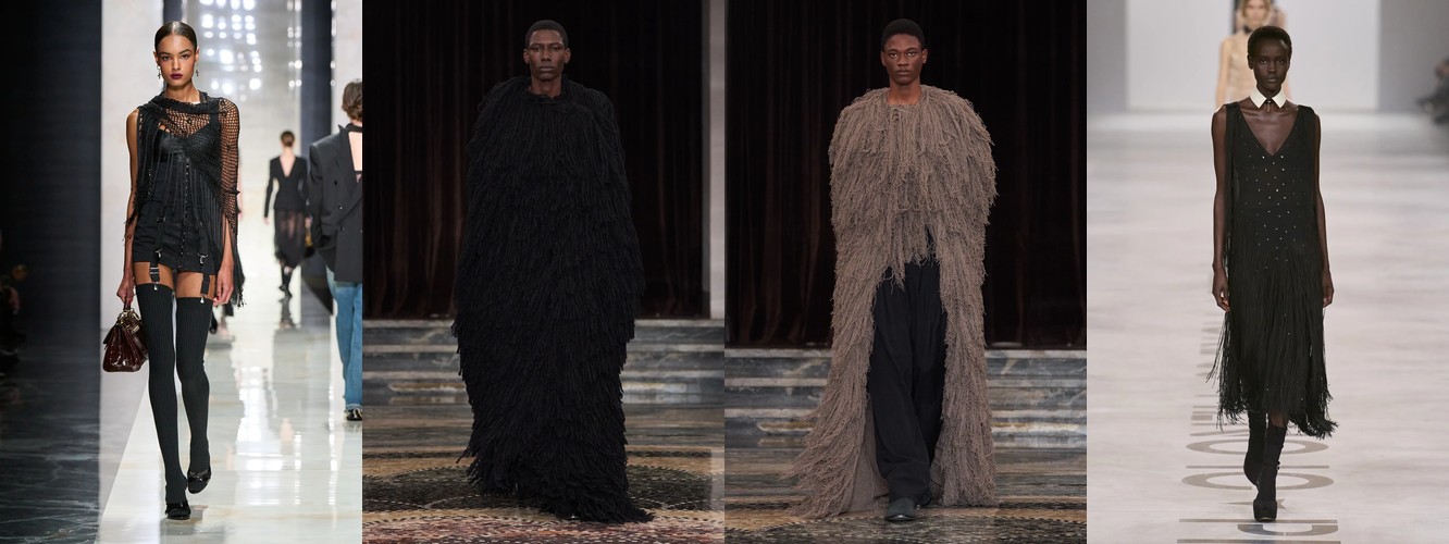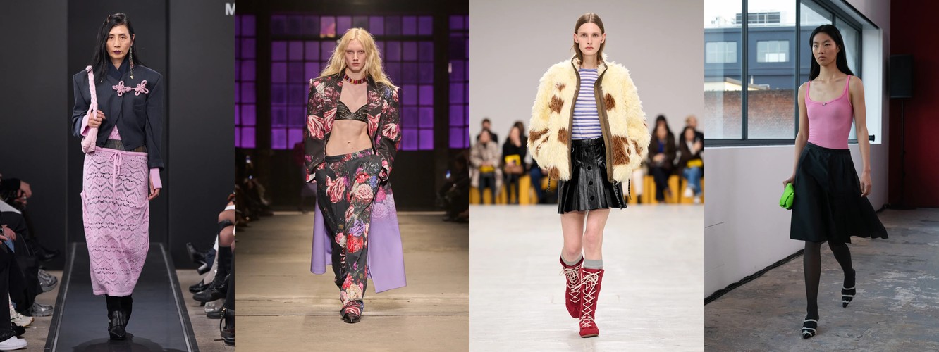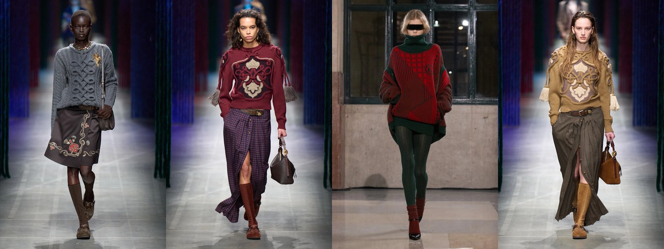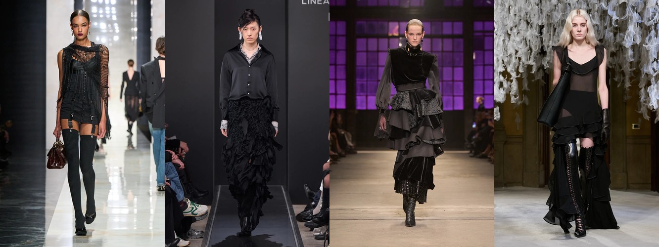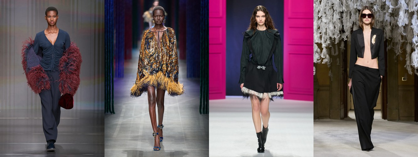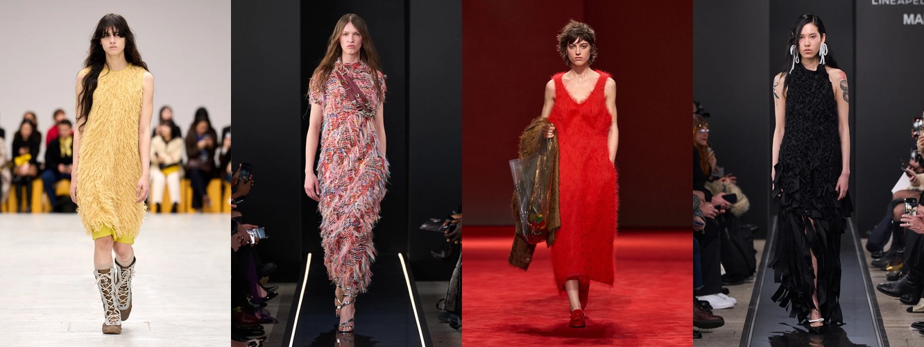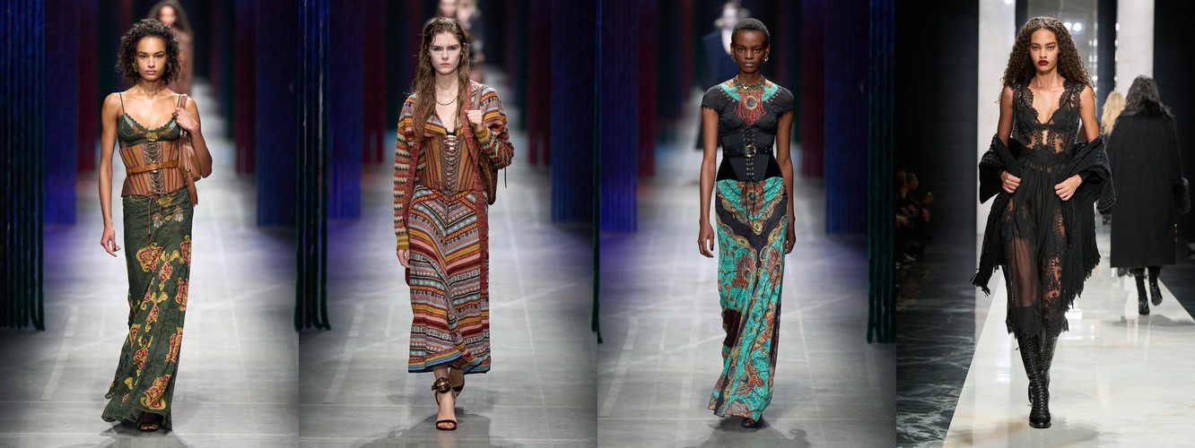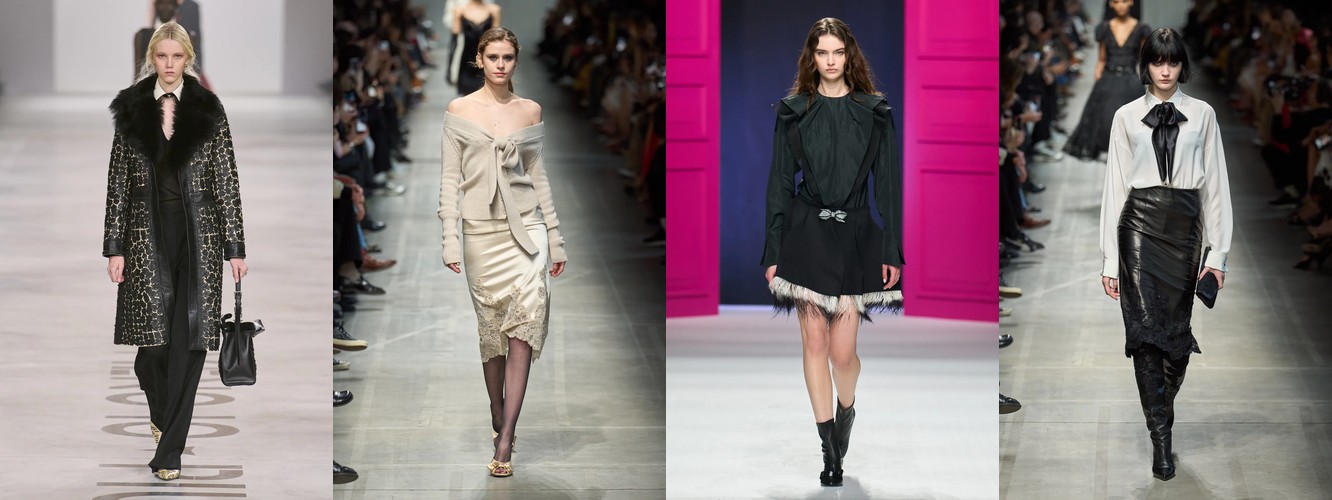 Женщина AW25-26, реконструированная через данные, была фланёркой и рассказчицей: она использовала мех, пайетки, бахрому и сложные принты как инструменты самовыражения в публичном пространстве. Её гардероб был полихромным, тактильно разнообразным, нагруженным субкультурными цитатами (гранж −39,34%, бохо +6,16%, но с очень низкой базой). Она выбирала мини, прозрачные ткани, открытые плечи — одежда работала как перформанс.