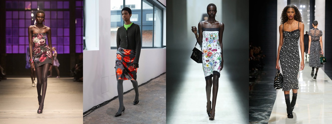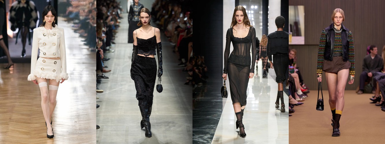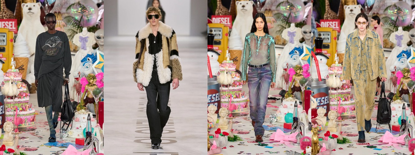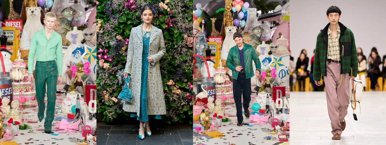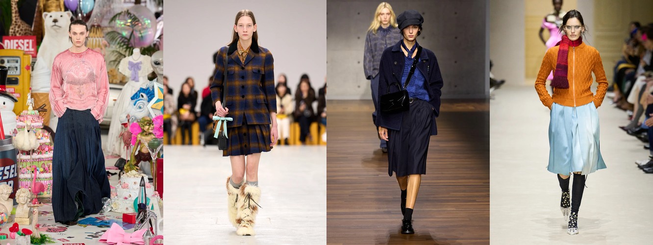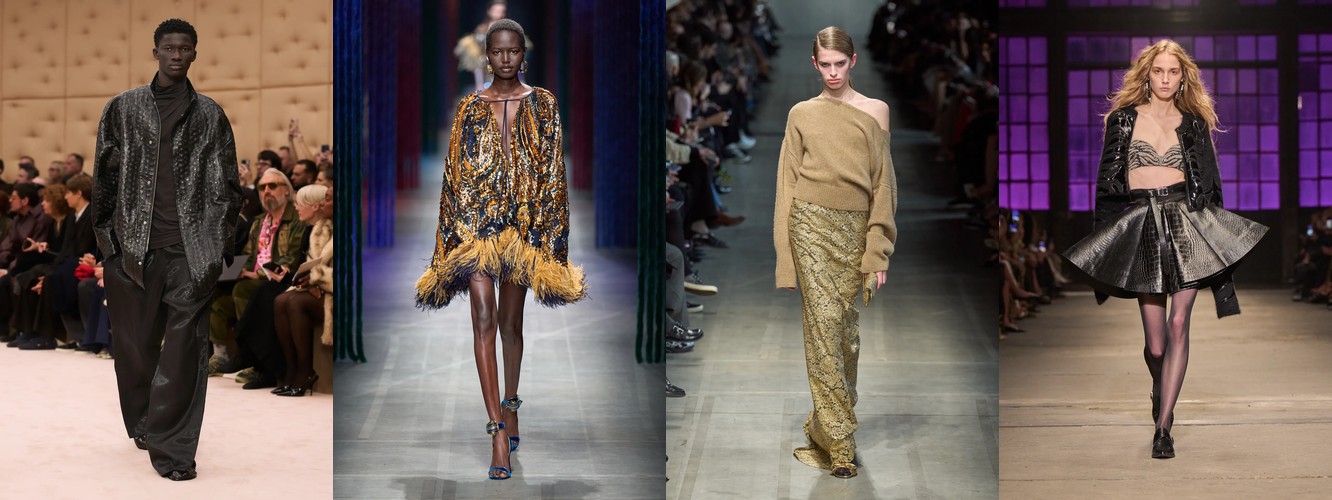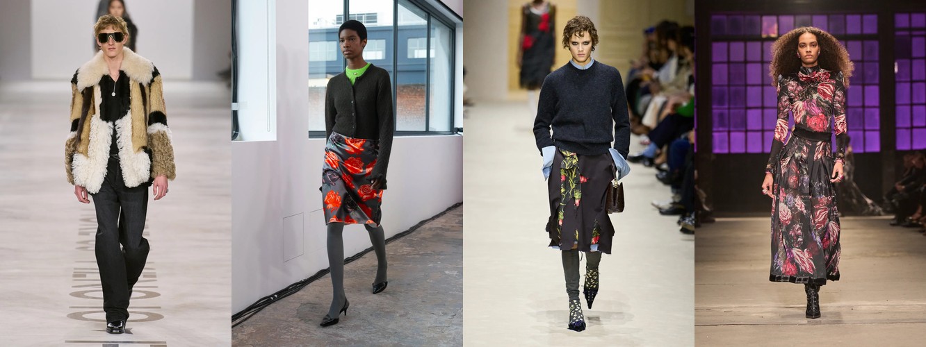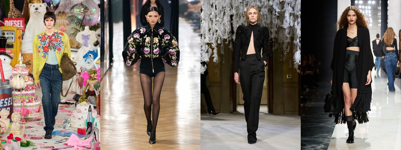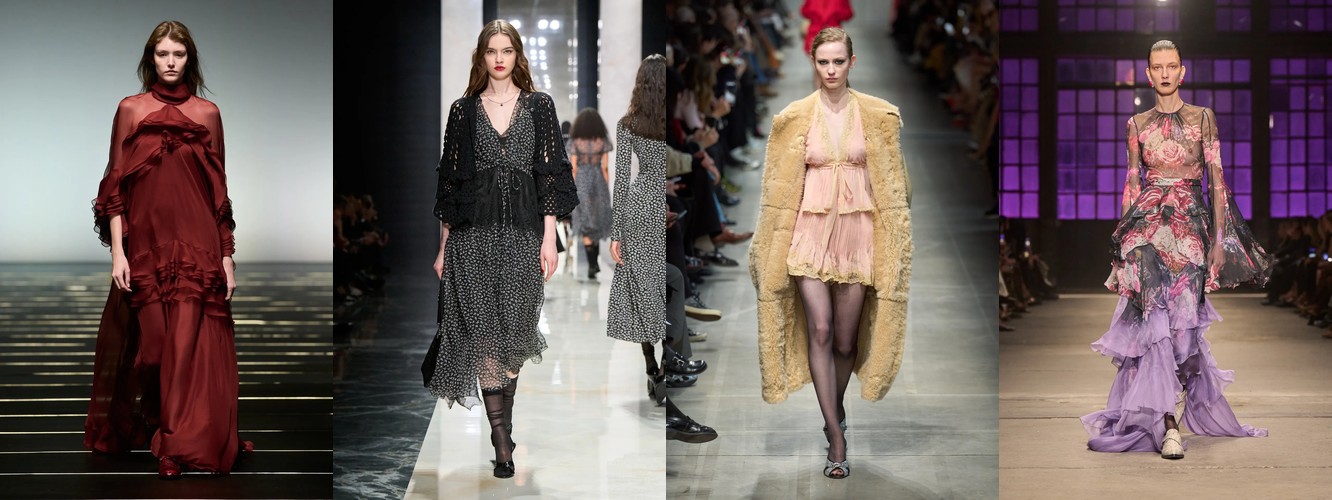 Женщина AW25-26, реконструированная через данные, была фланёркой и рассказчицей: она использовала мех, пайетки, бахрому и сложные принты как инструменты самовыражения в публичном пространстве. Её гардероб был полихромным, тактильно разнообразным, нагруженным субкультурными цитатами (гранж −39,34%, бохо +6,16%, но с очень низкой базой). Она выбирала мини, прозрачные ткани, открытые плечи — одежда работала как перформанс.