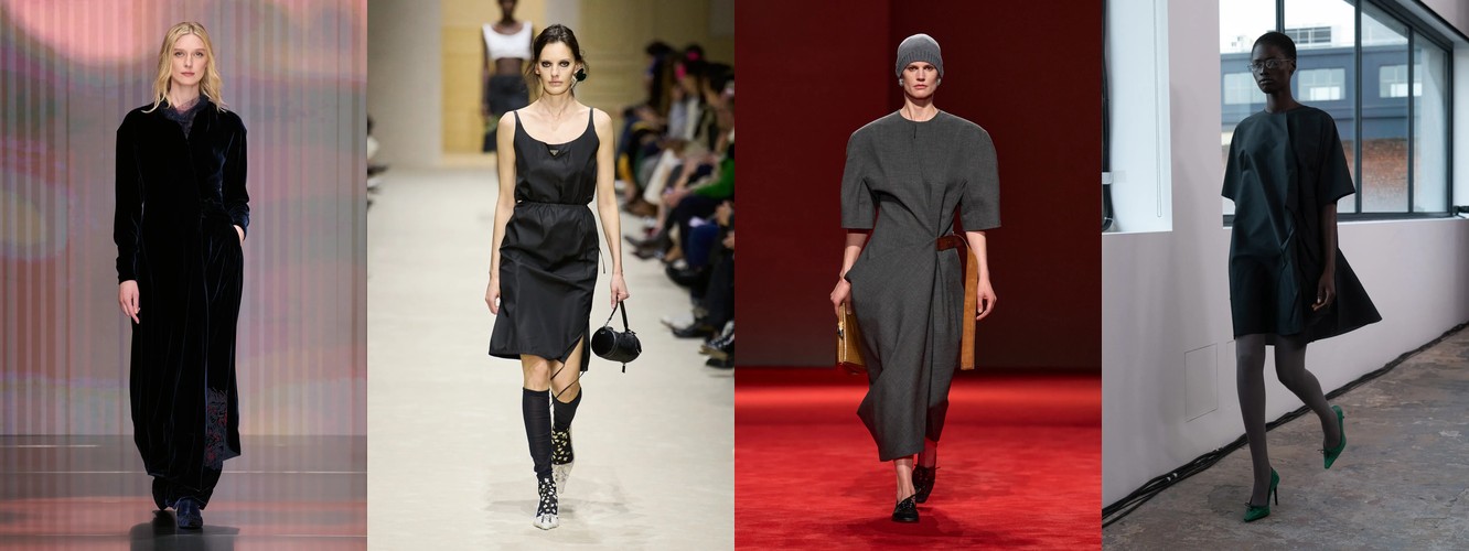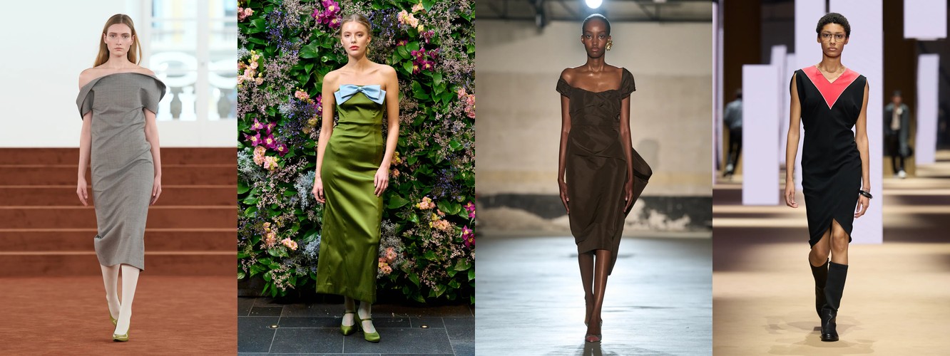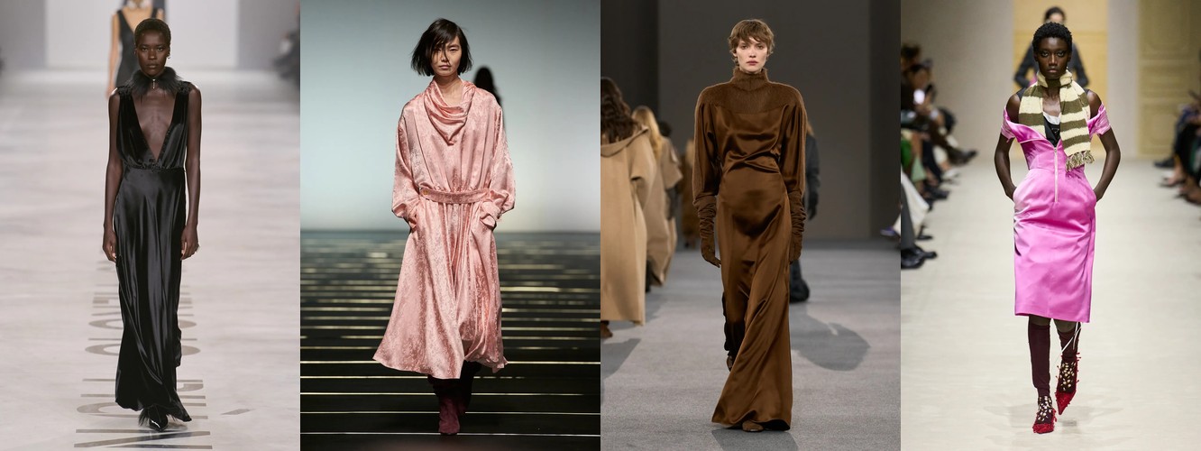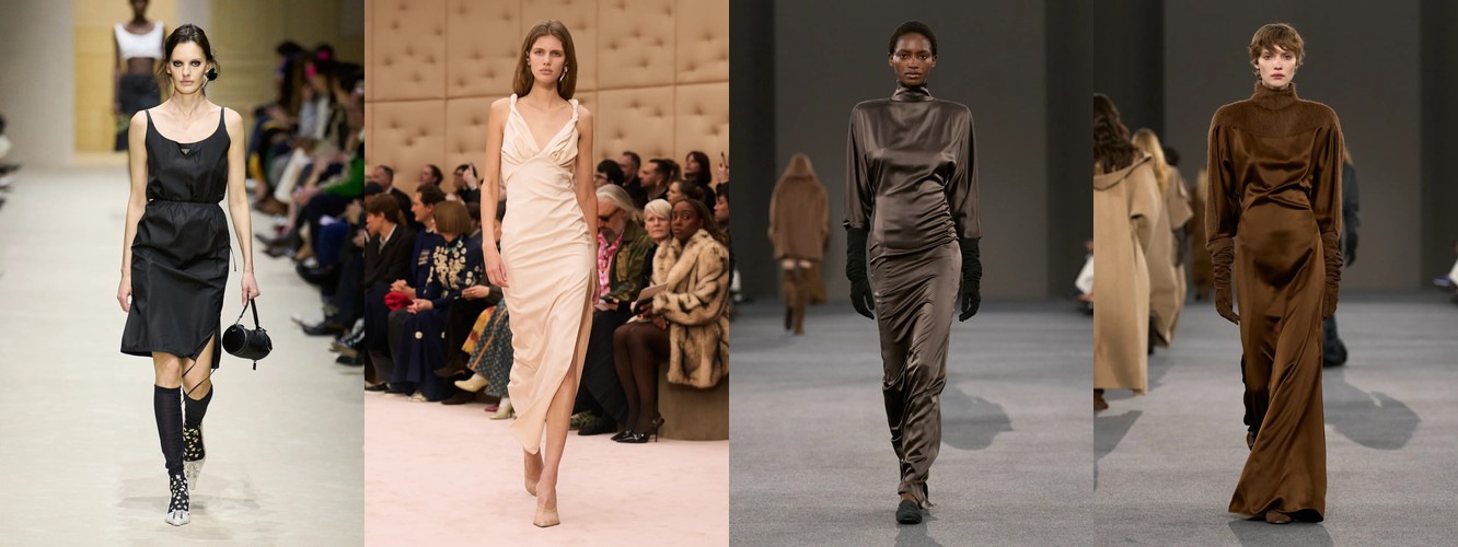 Платье-блейзер (+83,61% при росте охвата с 18% до 32%) и атласное платье (+45,08% при росте охвата с 38% до 65%) — два полярных, но симптоматичных сигнала. Первый фиксирует гибридизацию платья и костюма — платье перестаёт быть альтернативой костюму и становится его продолжением. Второй указывает на сохранение «чувственной» линии, но в формате, управляемом минимализмом: атлас — это не декор, а свет на ткани.