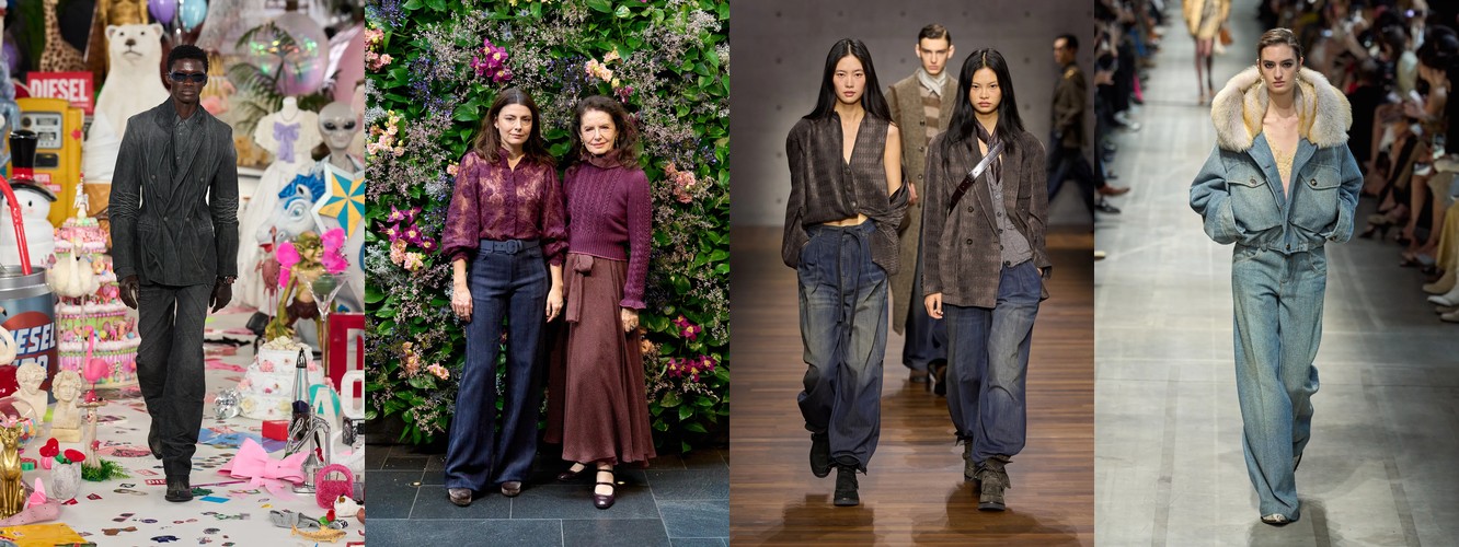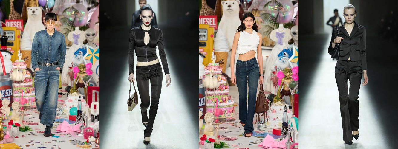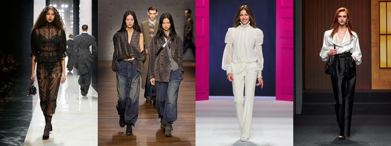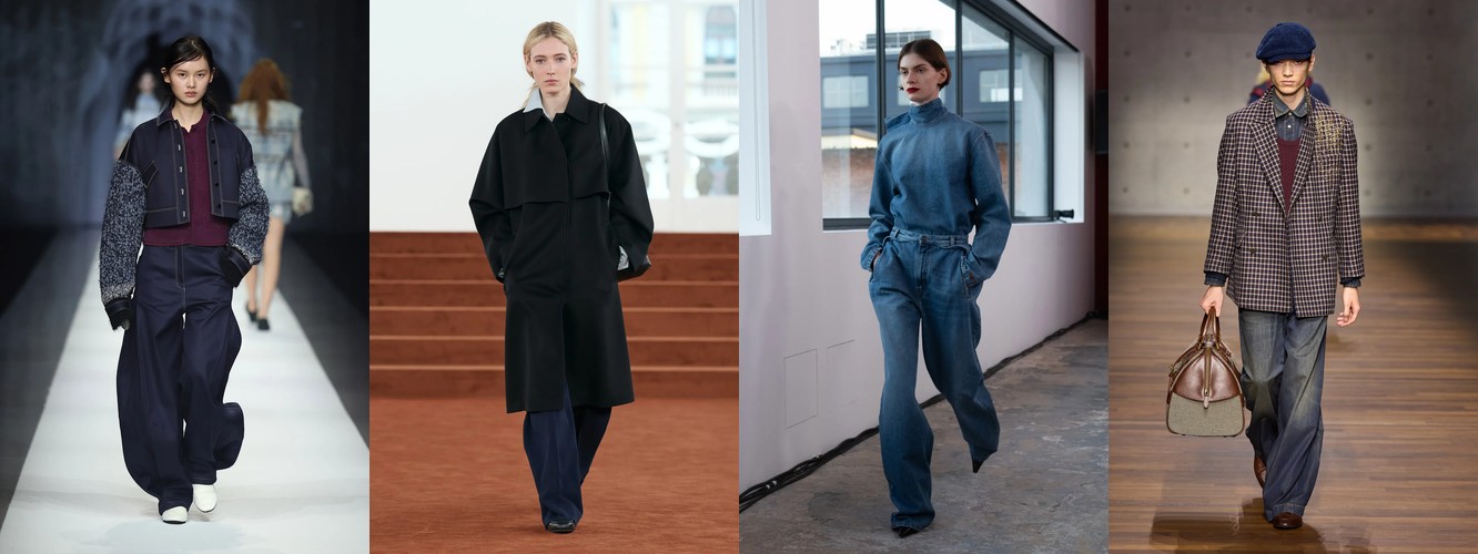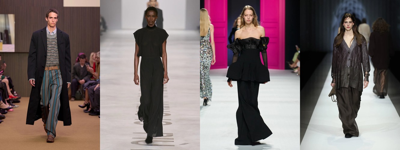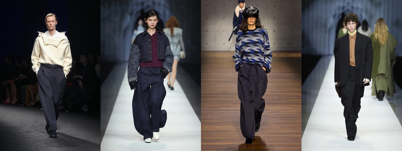 Это не отступление оверсайза — это его перекодирование. Объём больше не транслируется через уютную рыхлость трикотажа (cocoon knit, chunky boyfriend sweater). Он переезжает в территорию структурированных тканей: костюмная шерсть, деним, техничные материалы. Широкие брюки (+2,29 п.п.), очень длинные брюки (+4,18 п.п., почти двукратный рост) и брюки палаццо (сохранение позиций при 2,24%) создают совершенно иной архетип объёма — не «обнимающий», а «архитектурный», не скрывающий тело, а создающий вокруг него пространство власти.