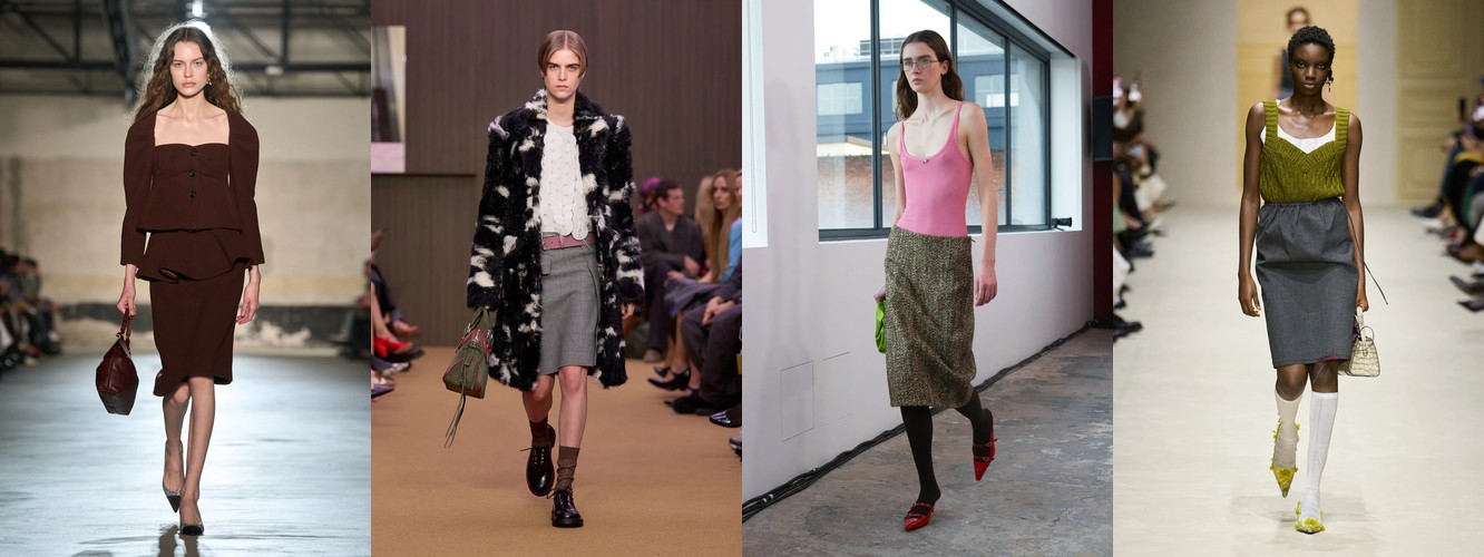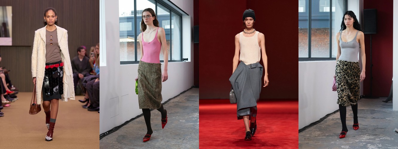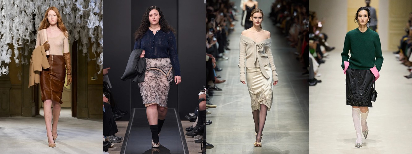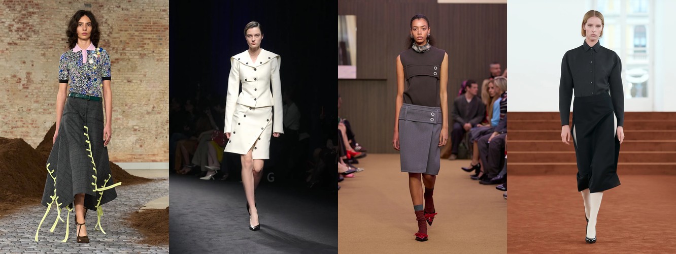 Юбка при этом не исчезает, но радикально перестраивает свою геометрию. Мини-юбка (−21,07%) и юбка с высокой талией (−0,13%) отступают; растут юбка миди (+16,76%), длинная юбка (+8,21%), юбка-карандаш (+12,77%), юбка с запахом (−4,26%, но стабильна), асимметричная юбка (+40,96%). Юбка перестаёт быть инструментом обнажения и становится инструментом моделирования — она удлиняет, оборачивает, создаёт диагональ.