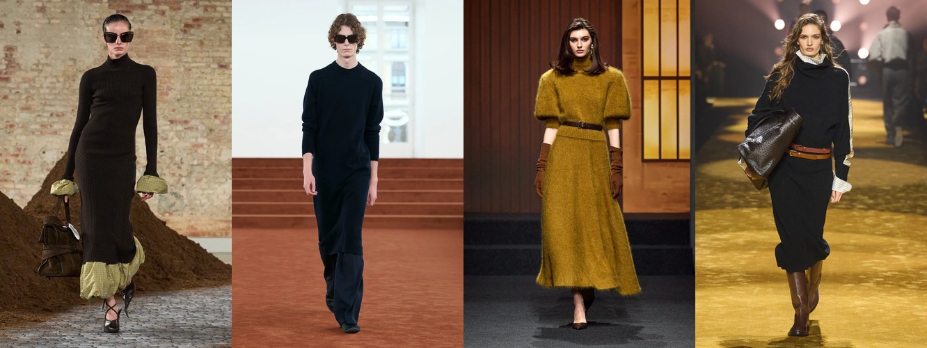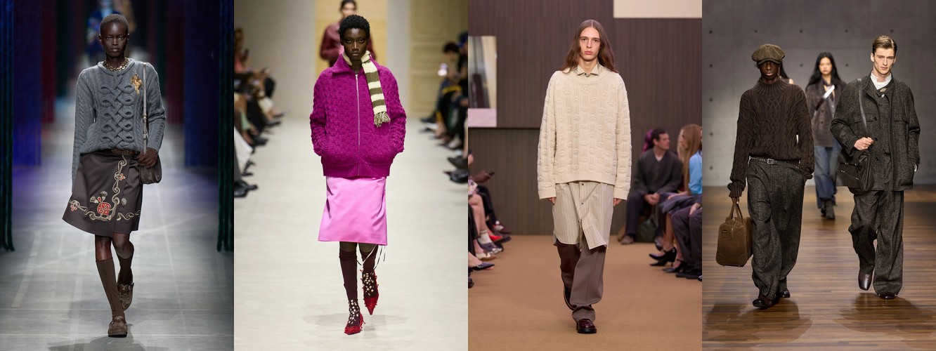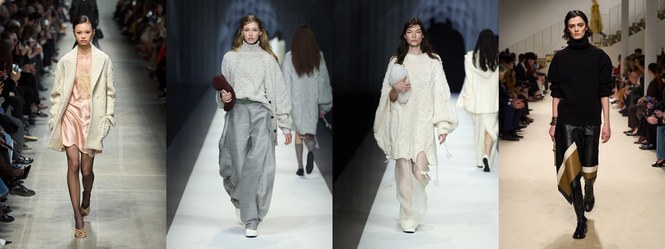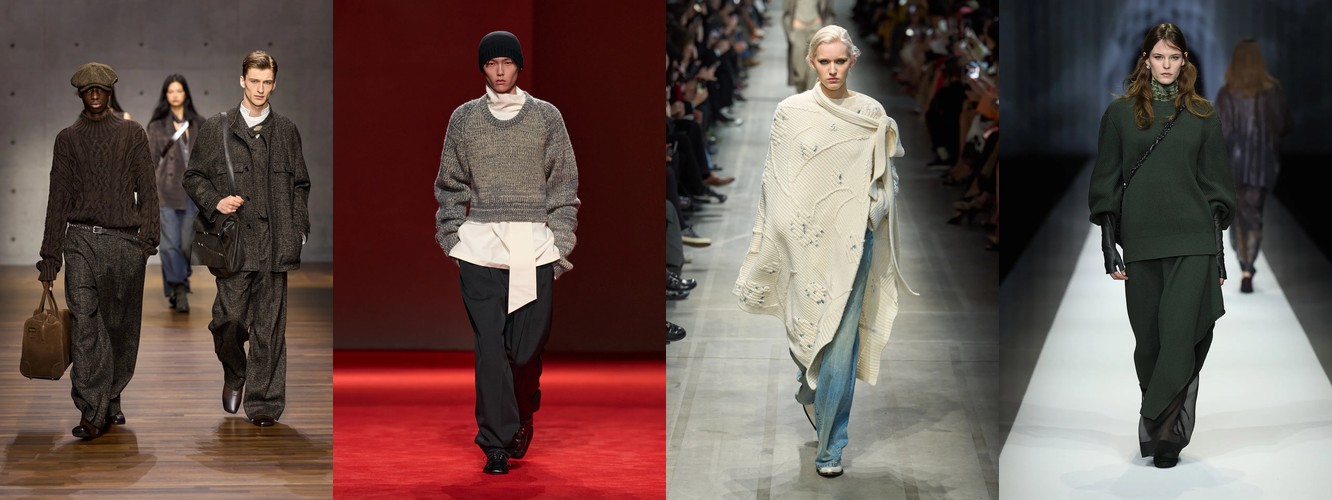 Суть трансформации: трикотаж теряет позиции как декоративный верхний слой (графический трикотаж −38,65%, украшенный трикотаж −42,53%, цветной трикотаж −29,63%) и набирает их как структурный элемент гардероба. Вязаные брюки — это трикотаж, мимикрирующий под тейлоринг. Толстая вязка и аран — это трикотаж как текстурный объём, а не как холст для принта. Водолазка — это трикотаж как архитектурная оболочка шеи. Во всех случаях трикотаж сохраняет тактильную ценность, но избавляется от визуальной «громкости».