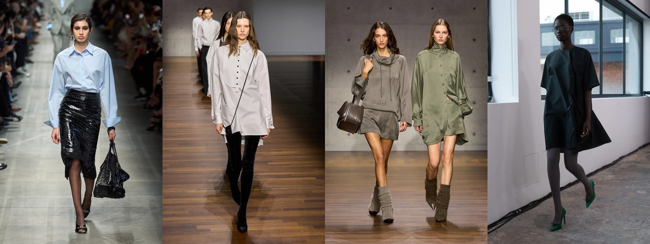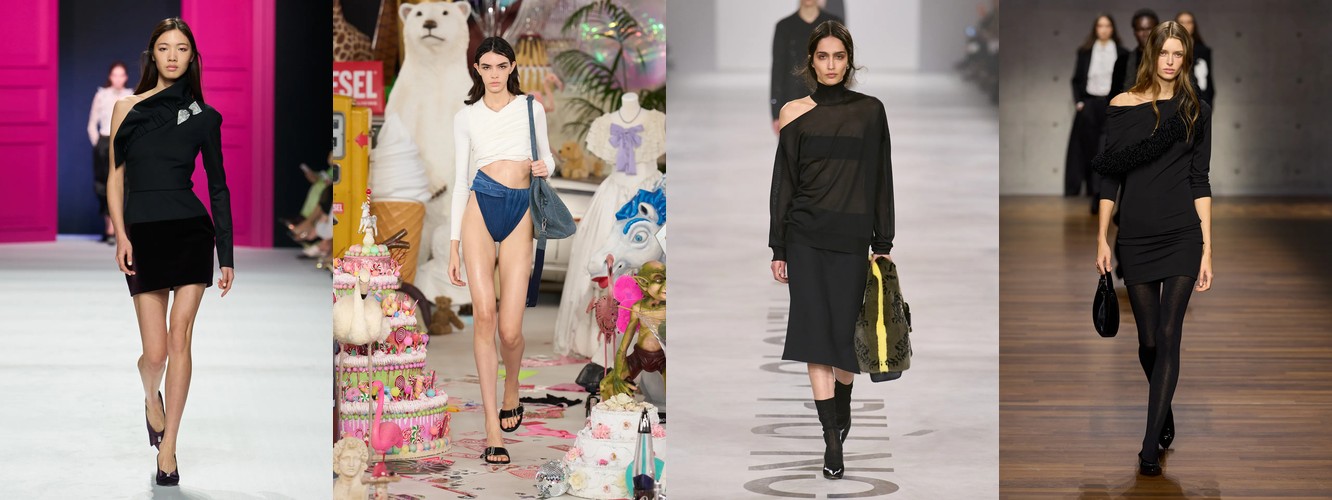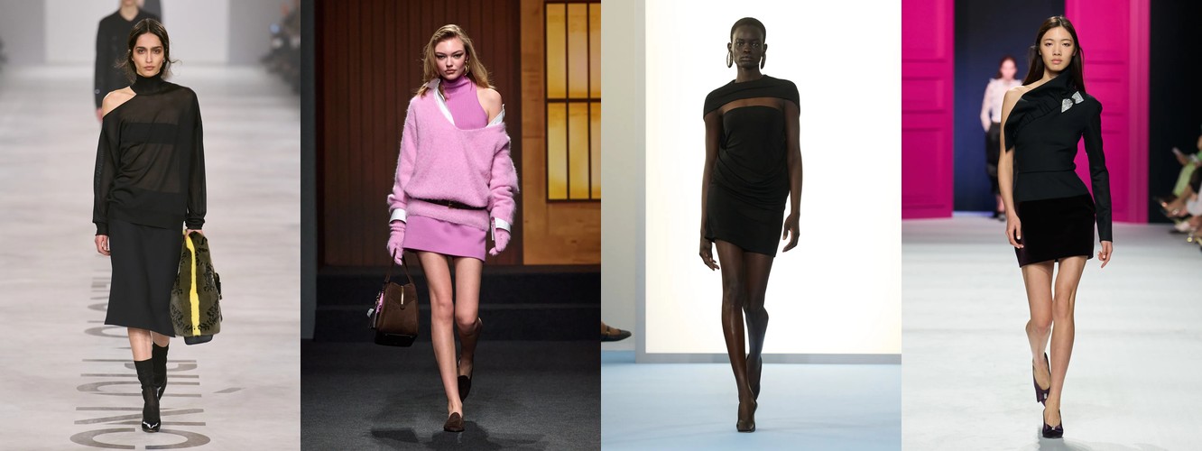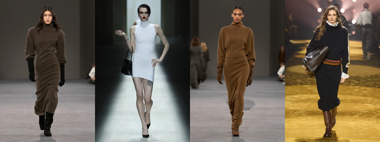 Одновременно снижаются атрибуты, связанные с прозрачностью (−28,92%) и экспозицией тела: мини-юбка (−21,07%), мини-платье (−25,59%), кроп-топ (−0,57%, стагнация), одно плечо (−42,5%). На их место приходят закрытые формы: высокий воротник (+28,82%), водолазка (+47,14%), платье с высокой горловиной (+65,43%), топ с высокой горловиной (+50,99%). Тело перестаёт быть объектом демонстрации и становится объектом защиты — или, точнее, объектом осознанного сокрытия как формы контроля.