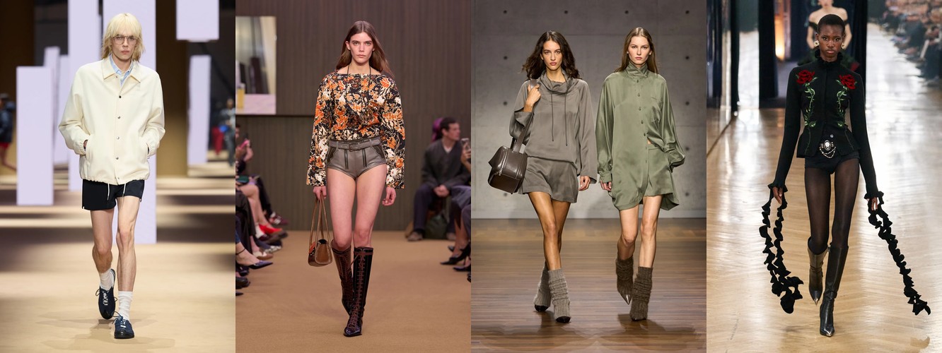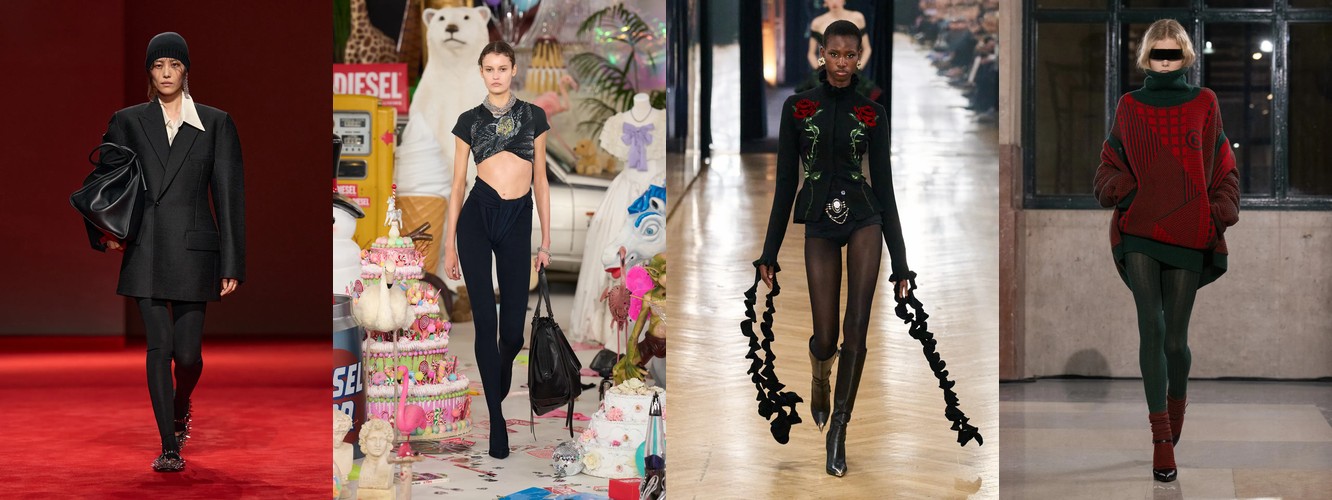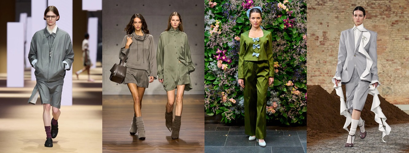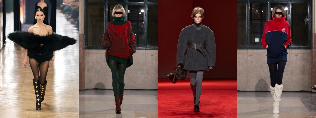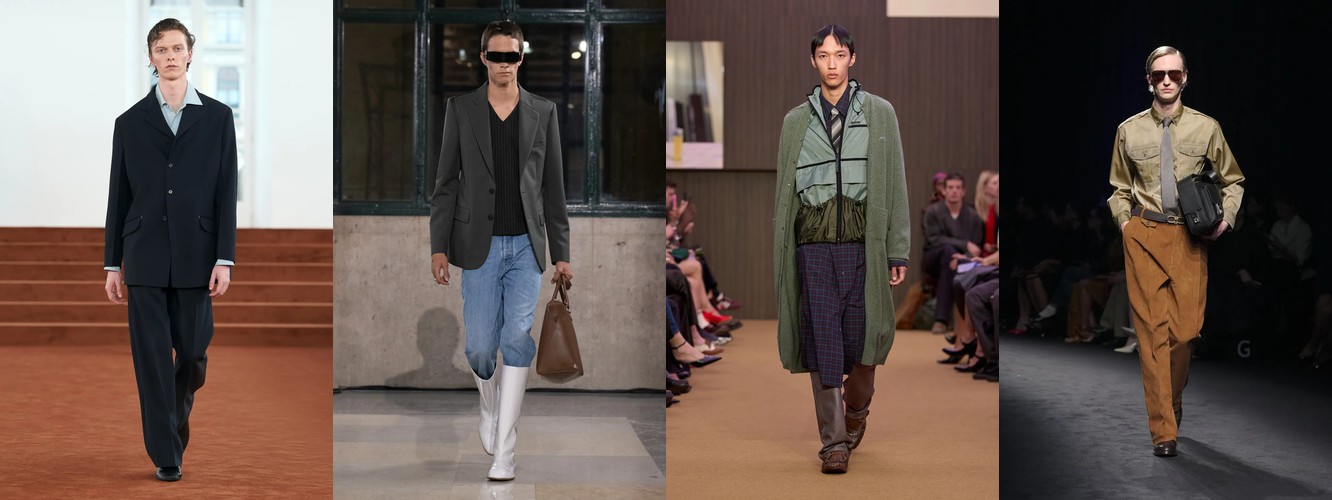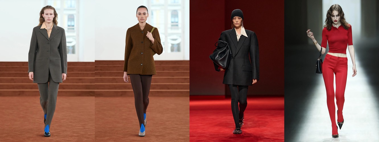 Рост очень длинных брюк (+94,57%) заслуживает отдельного внимания. В сочетании с ростом костюмных брюк и блейзера этот атрибут формирует силуэт, в котором линия ноги максимально удлинена, а граница между обувью и одеждой размыта. Это визуальный приём, хорошо знакомый по мужскому тейлорингу и «архивному» Maison Margiela, — он создаёт иллюзию непрерывной вертикали и работает как маркер архитектурного мышления в стайлинге.