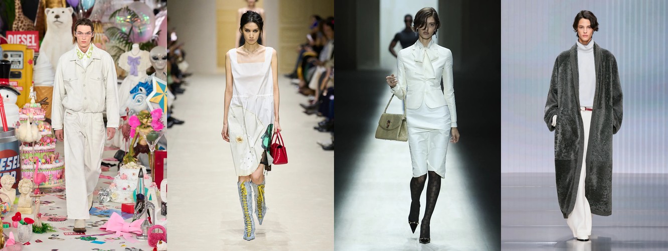 Белый «кипенно-белый» совершает скачок с 5,45% до 10,03% (+84,04%), почти удваивая свою долю. Это не «летний белый», случайно попавший в осеннюю палитру; это — стратегический контрапункт тотальной черноте, создающий максимально контрастную, графичную систему координат. Чёрное + белое = классический язык модернизма, архитектуры, типографики. Мода перенимает визуальный код дисциплин, связанных с проектированием, а не украшением.