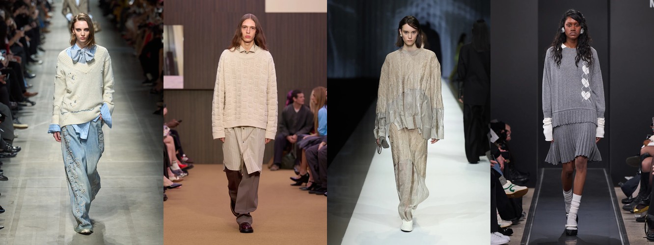 Одна из самых тонких трансформаций сезона скрыта в кросс-категориальном перетекании оверсайз-силуэта. На первый взгляд, оверсайз продолжает расти: общий атрибут прибавил 2,3 п.п. (до 12,12%), оверсайз-брюки — 6,36 п.п. (до 17,97%), оверсайз-крой — 4,9 п.п. (до 17,21%). Но при этом оверсайз-трикотаж снизился с 3,90% до 3,62%, а его охват брендов сократился с 70% до 59% — то есть треть домов, ранее предлагавших мягкий объём в вязаных изделиях, от него отказалась.