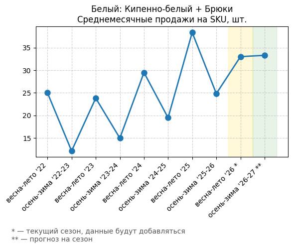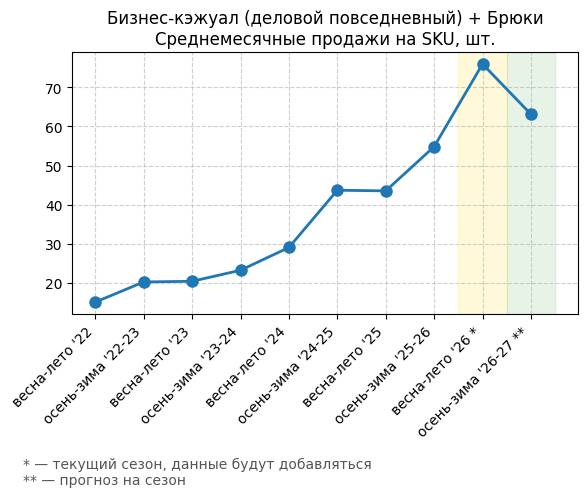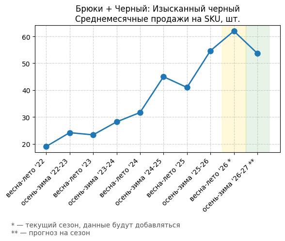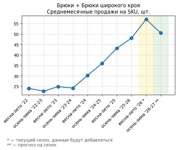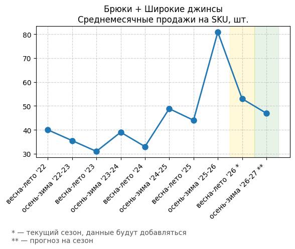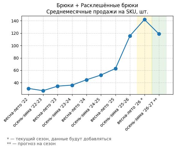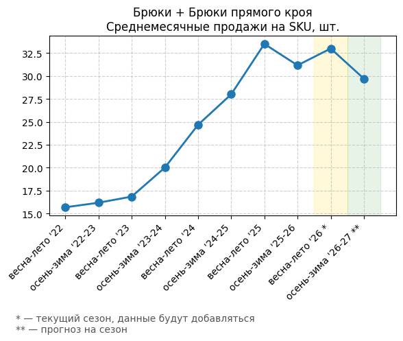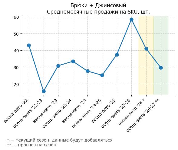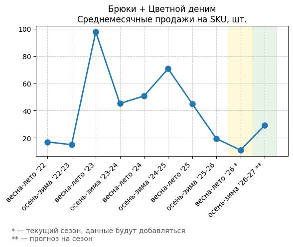 Брюки + Цветной деним - Среднемесячные продажи на SKU, шт.
