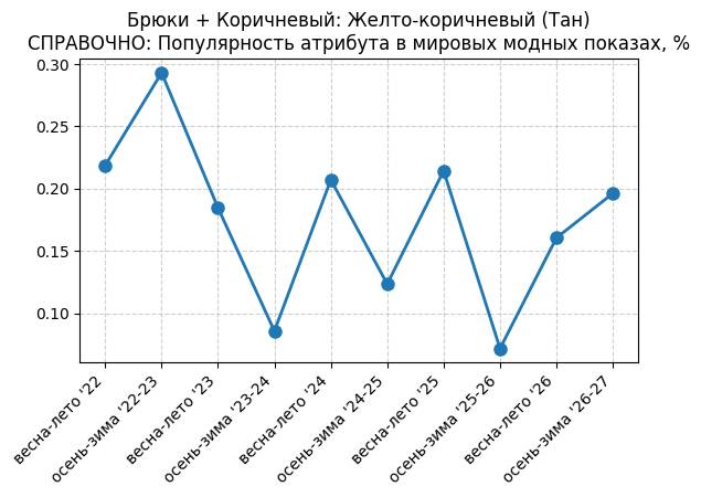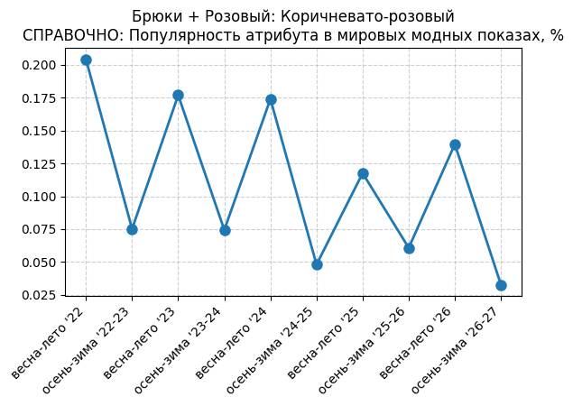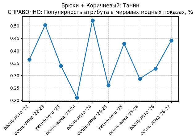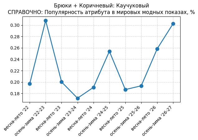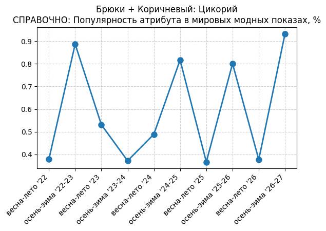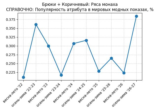 Брюки + Коричневый: Крушина - СПРАВОЧНО: Популярность атрибута в мировых модных показах, %