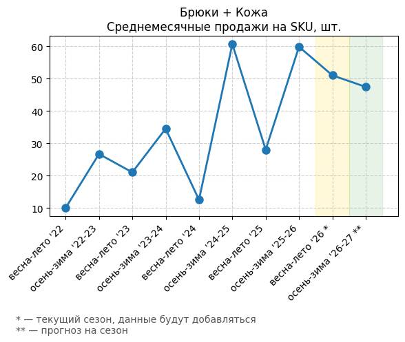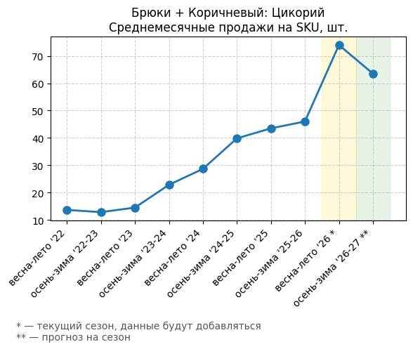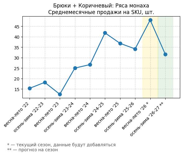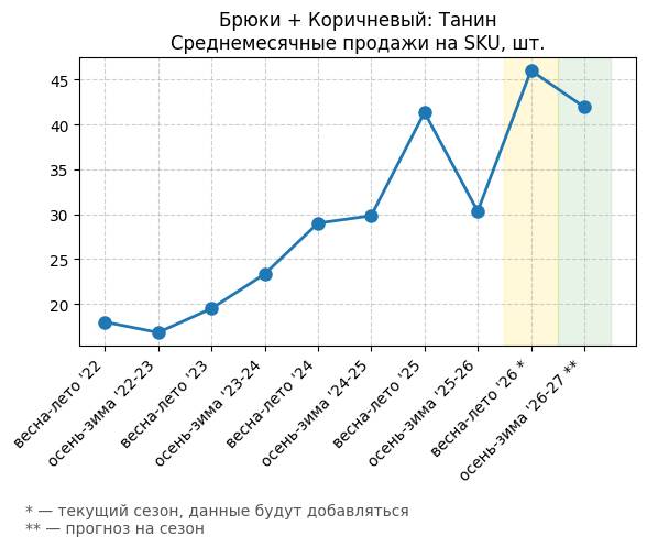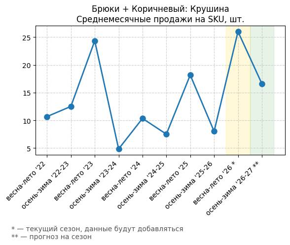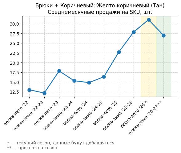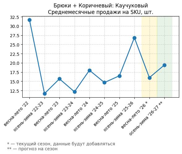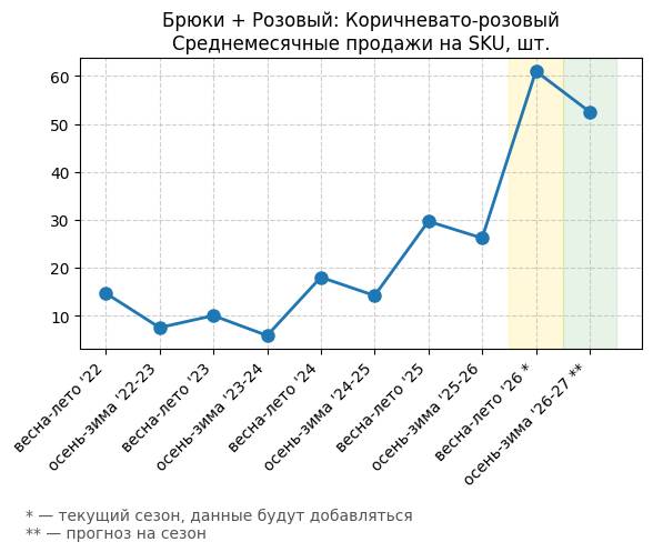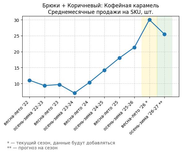 Брюки + Коричневый: Кофейная карамель - Среднемесячные продажи на SKU, шт.