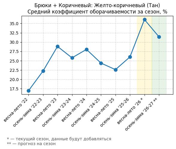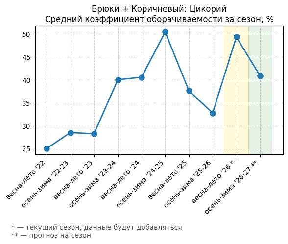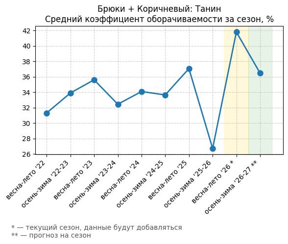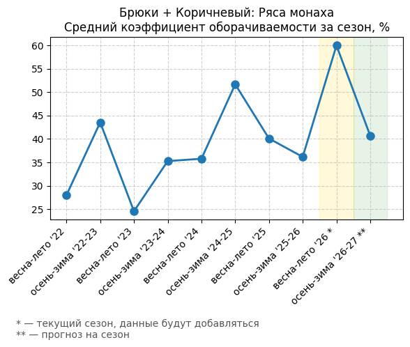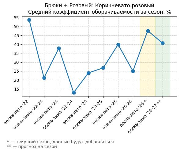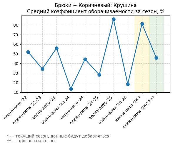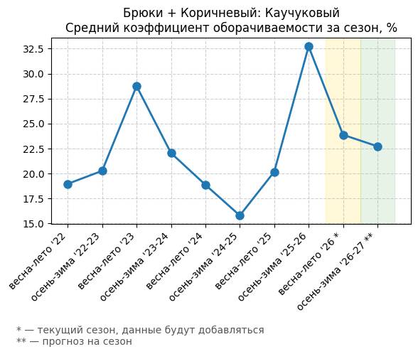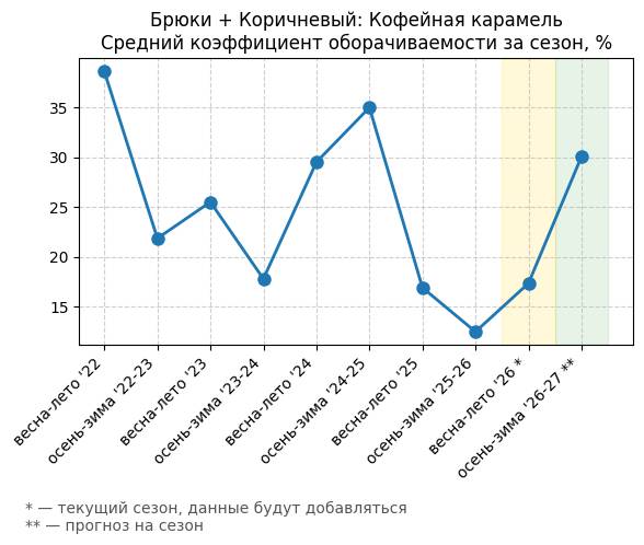 Брюки + Коричневый: Кофейная карамель - Средний коэффициент оборачиваемости за сезон, %