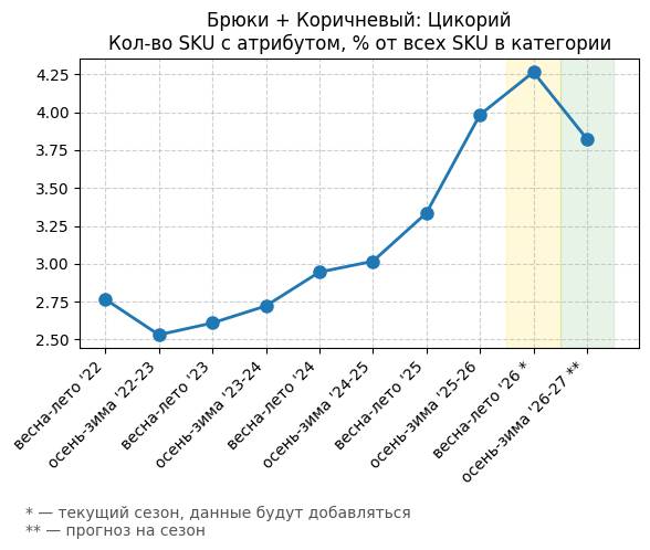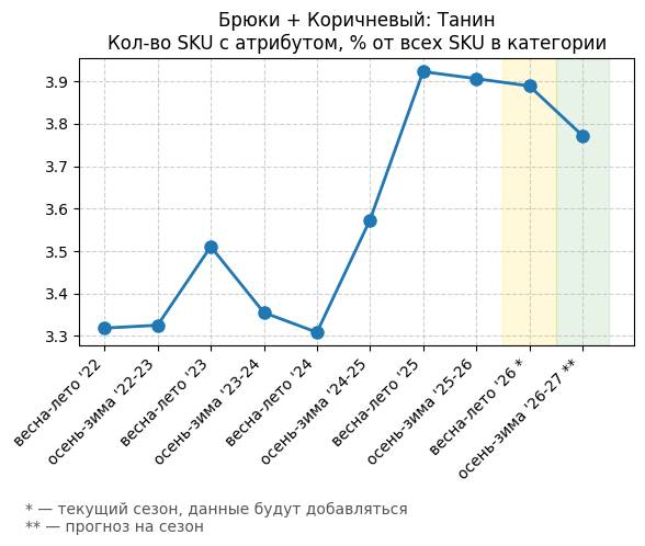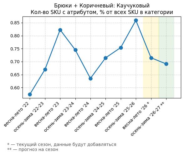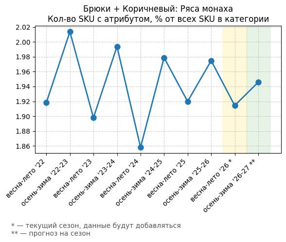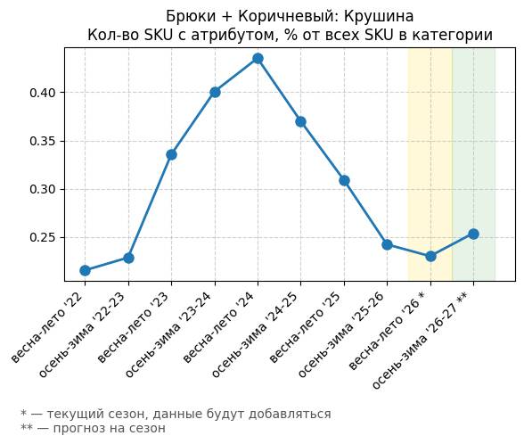 Брюки + Коричневый: Крушина - Кол-во SKU с атрибутом, % от всех SKU в категории
