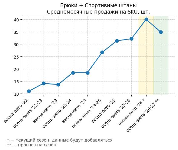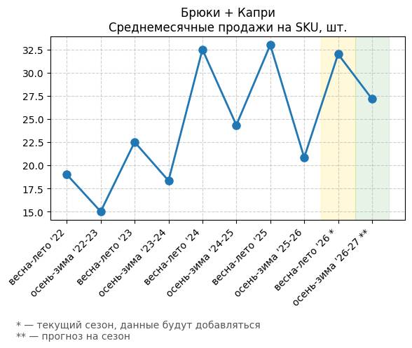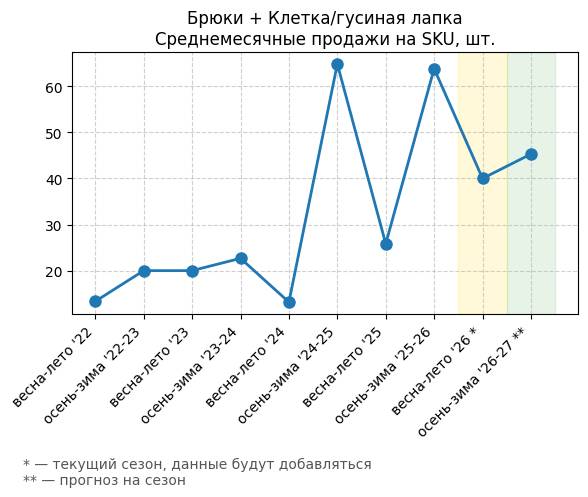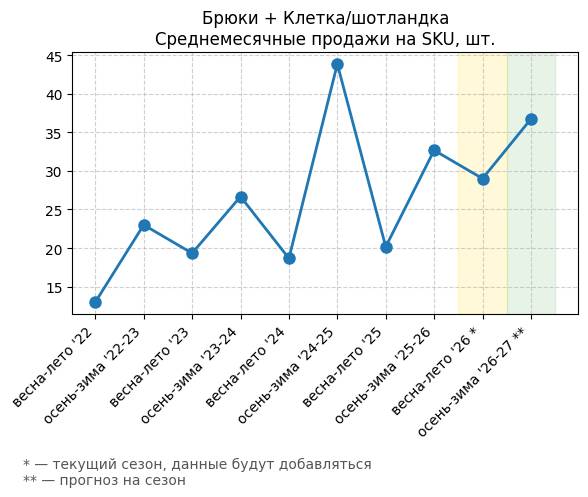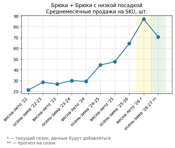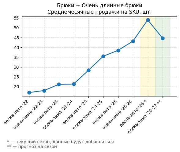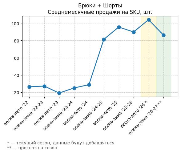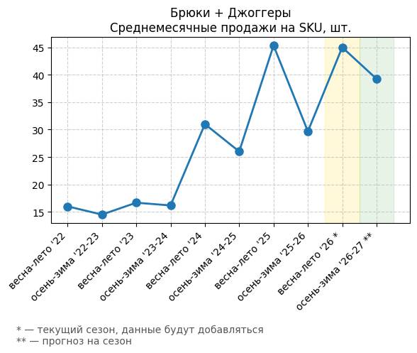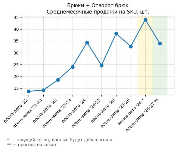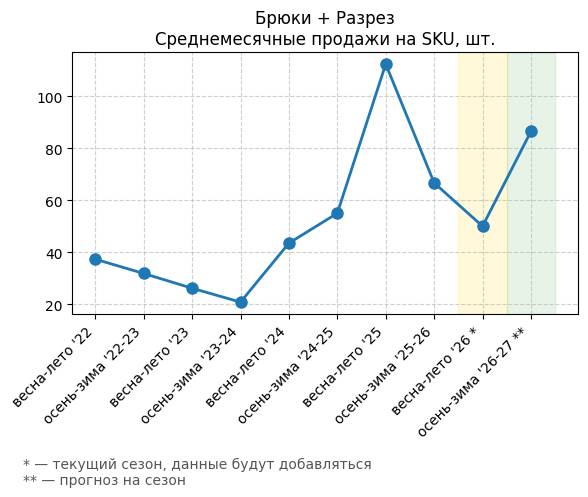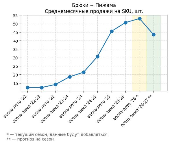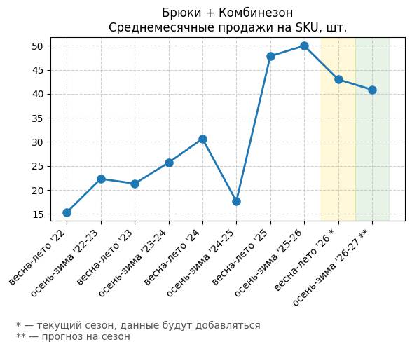 Брюки + Комбинезон - Среднемесячные продажи на SKU, шт.