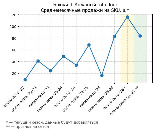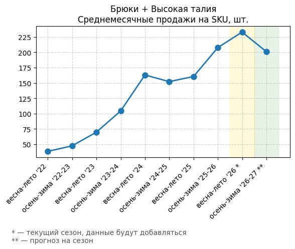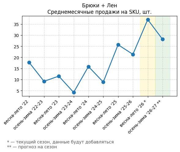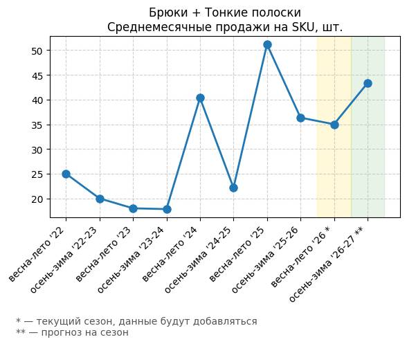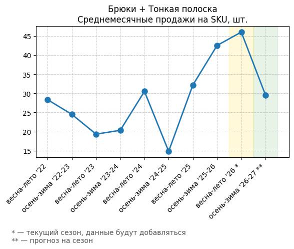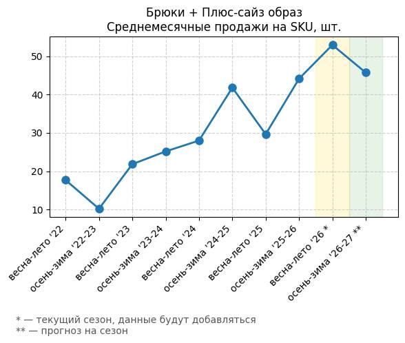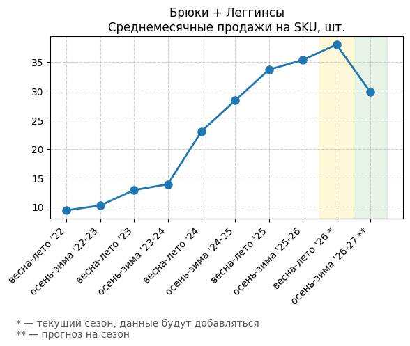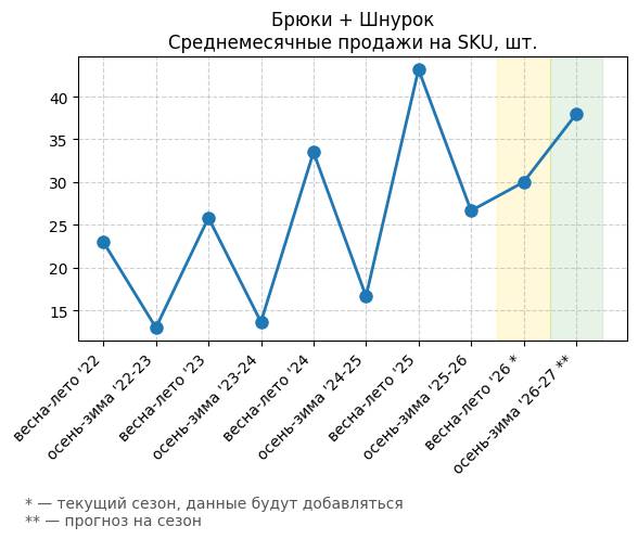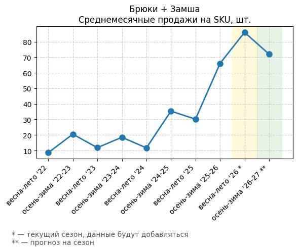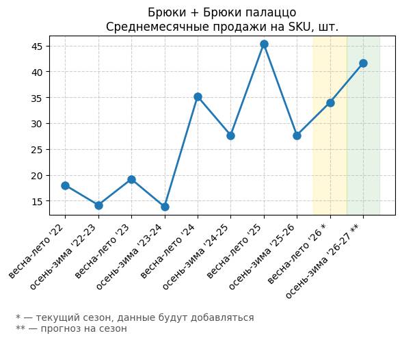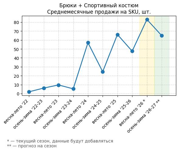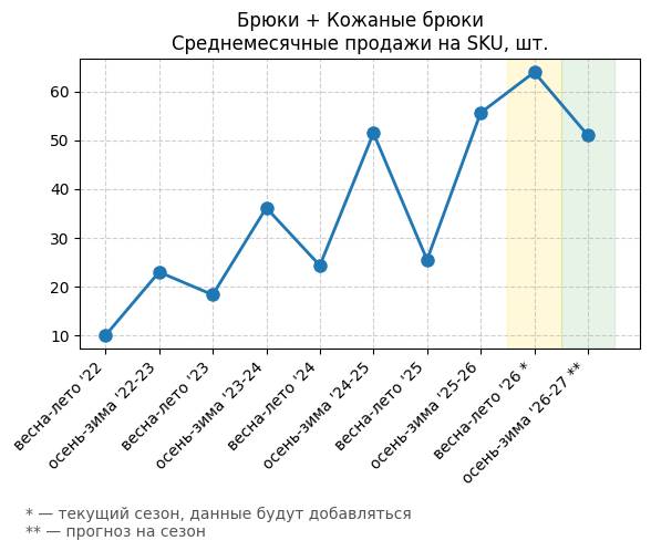 Брюки + Комбинезон - Среднемесячные продажи на SKU, шт.
