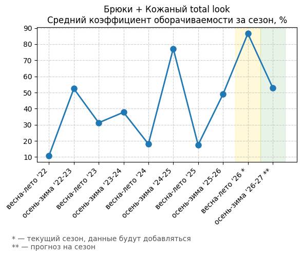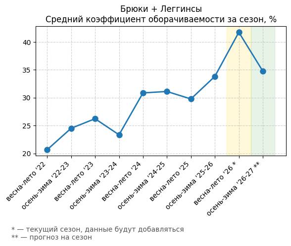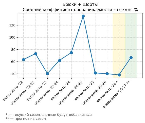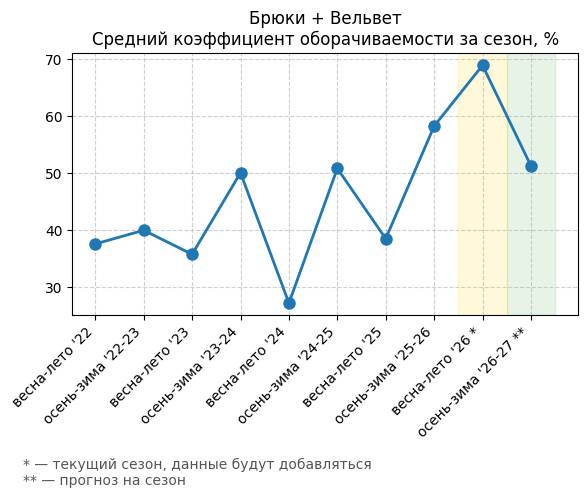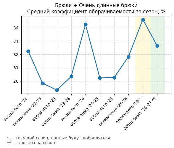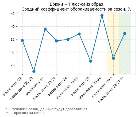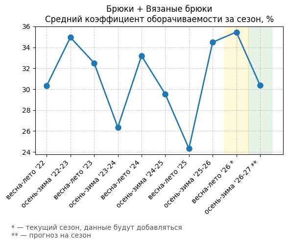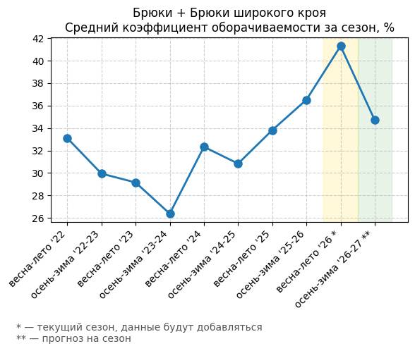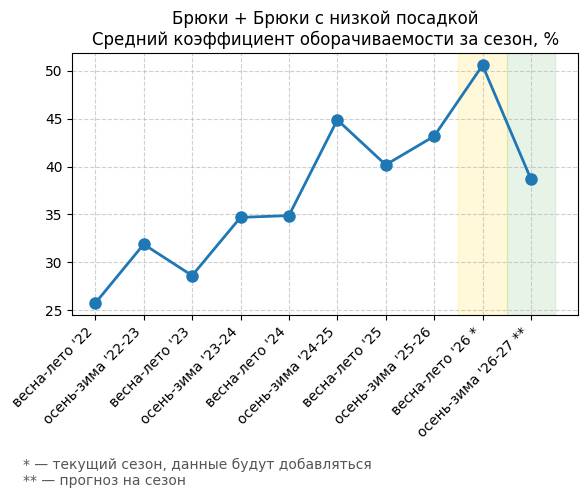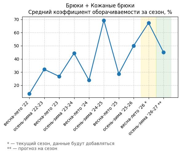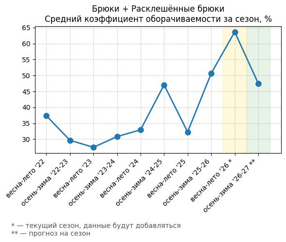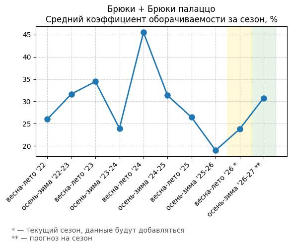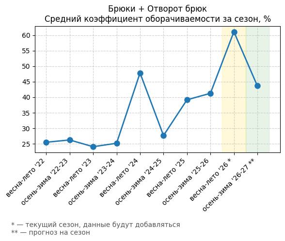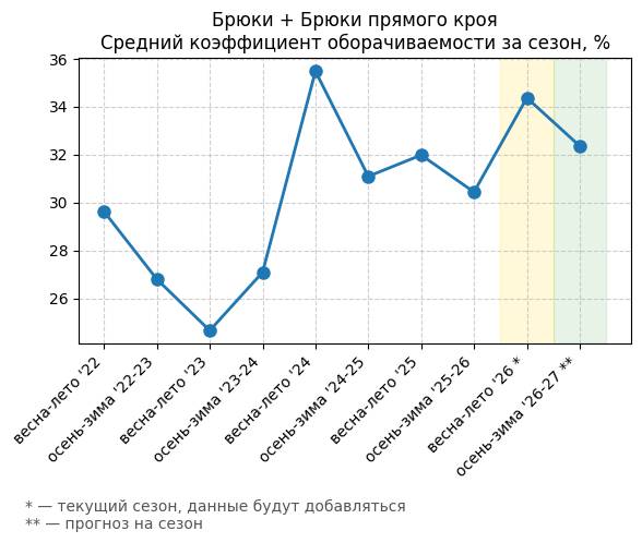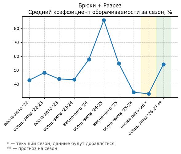 Брюки + Разрез - Средний коэффициент оборачиваемости за сезон, %