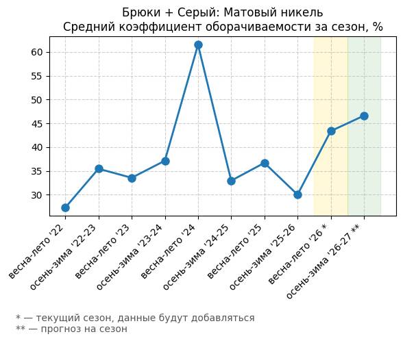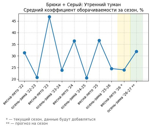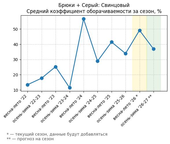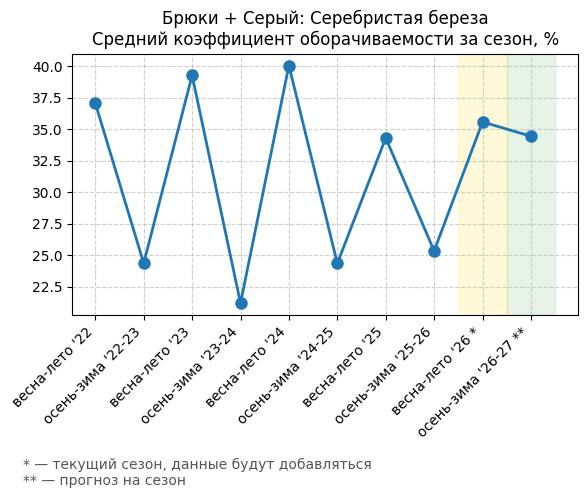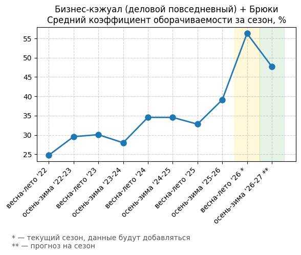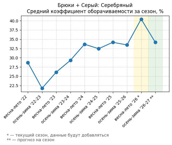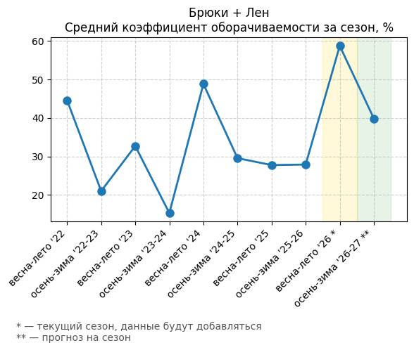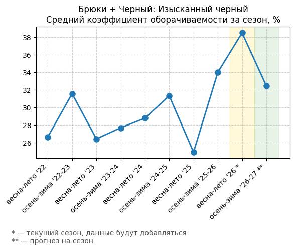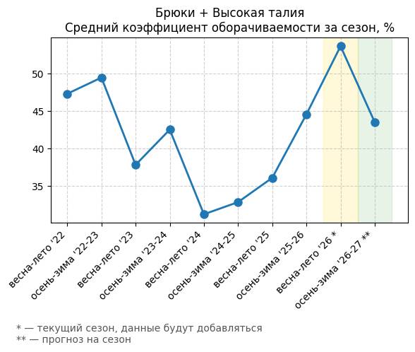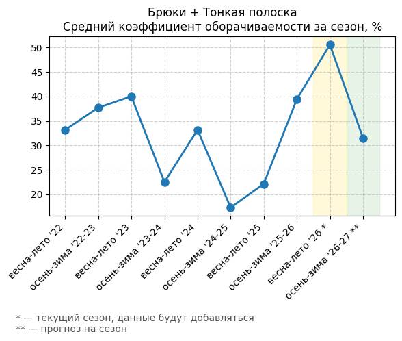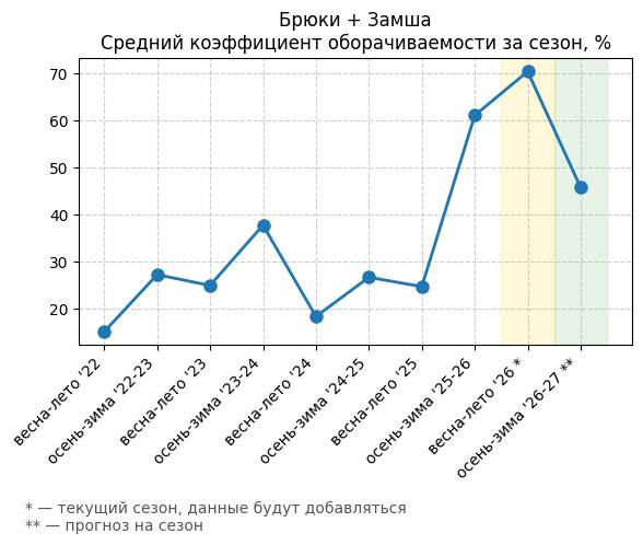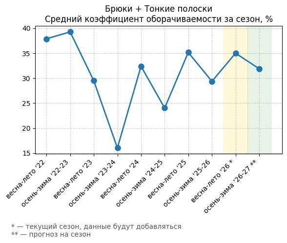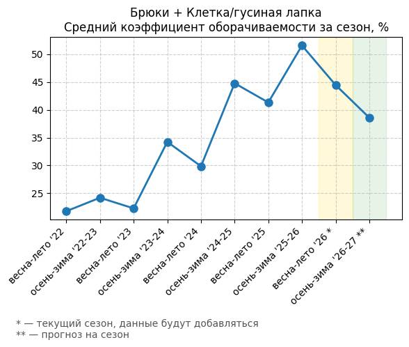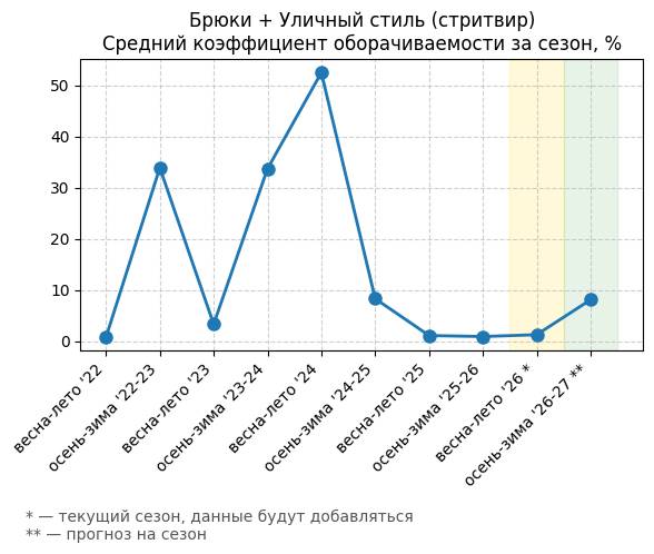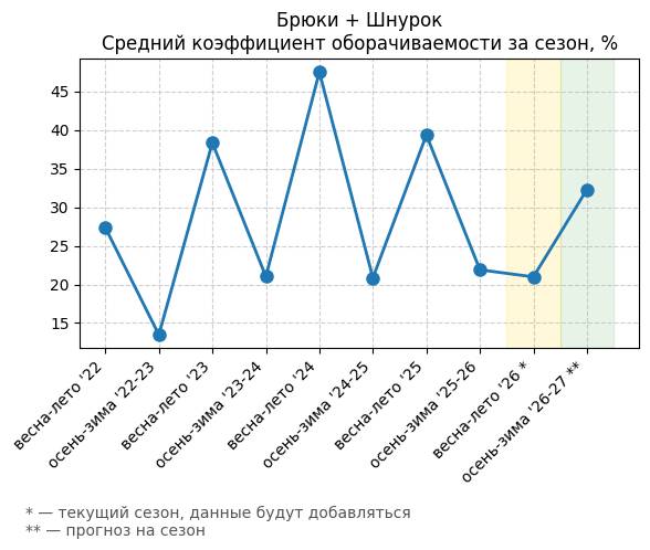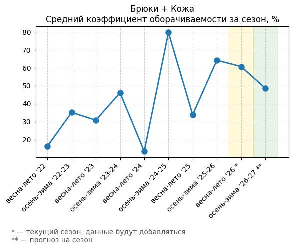 Брюки + Разрез - Средний коэффициент оборачиваемости за сезон, %