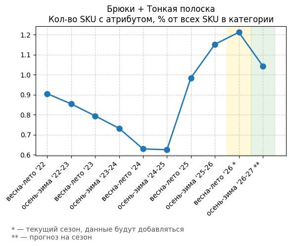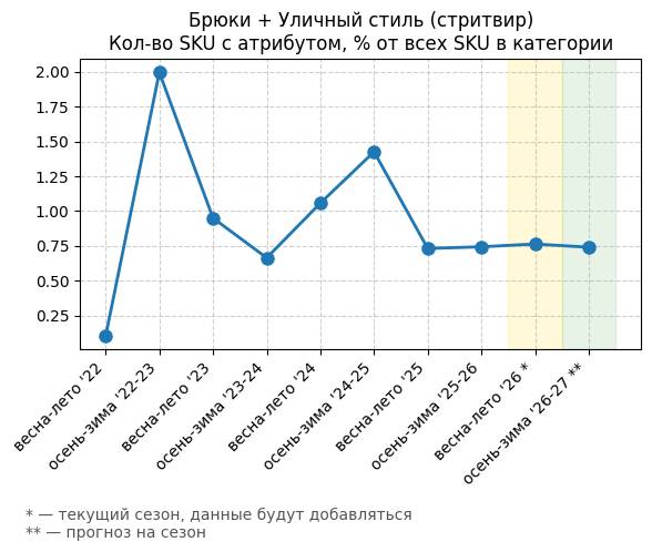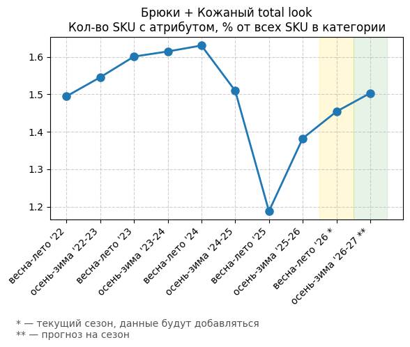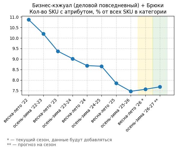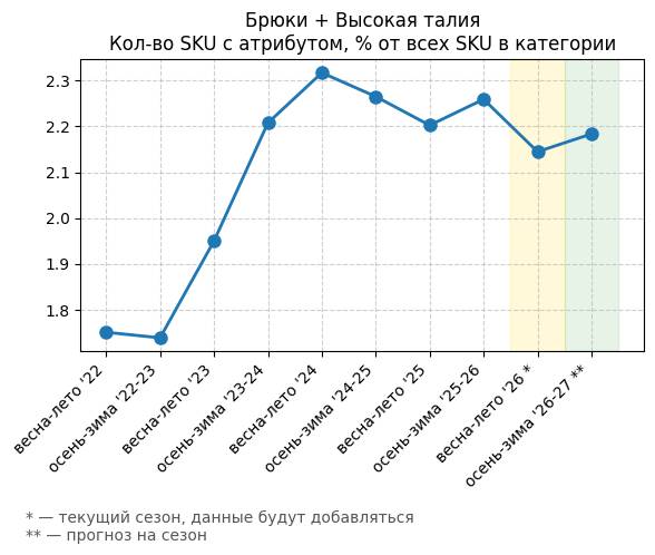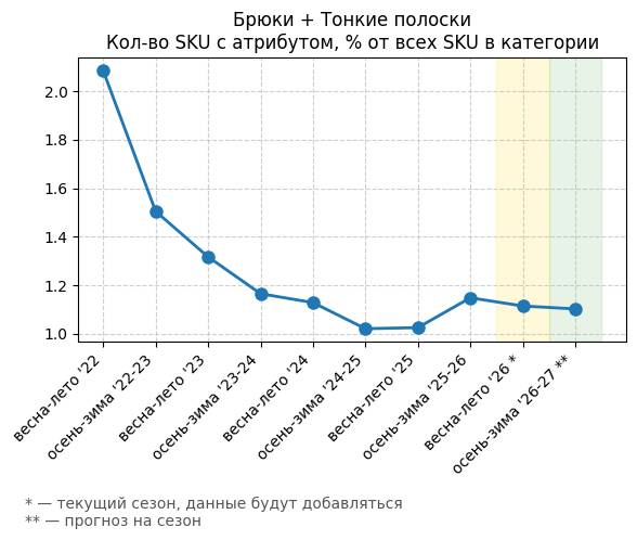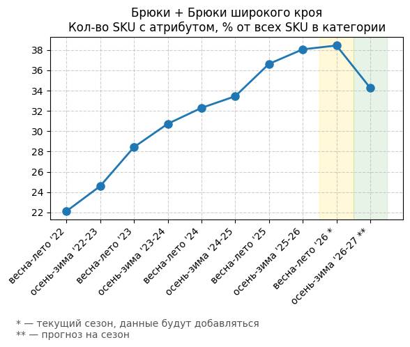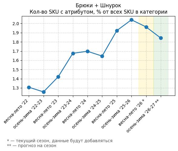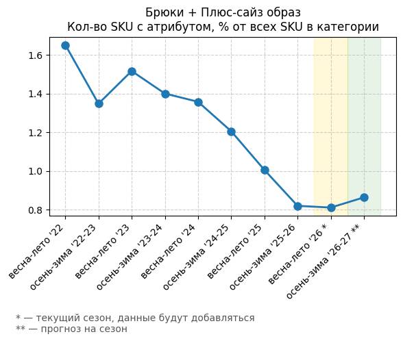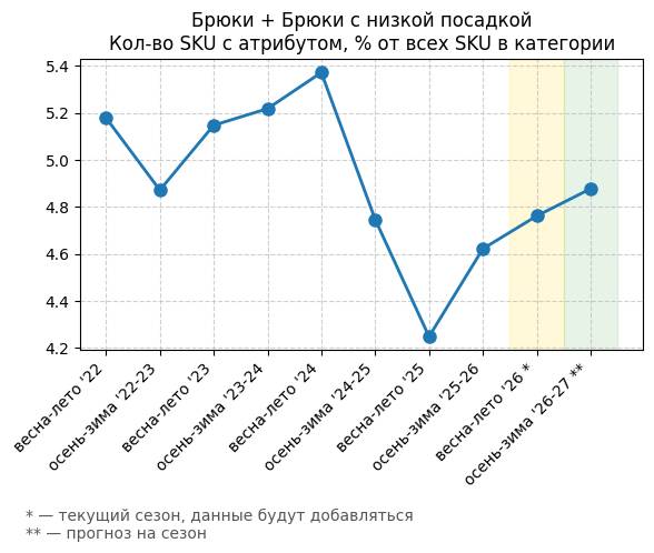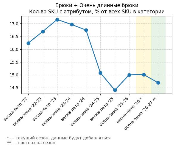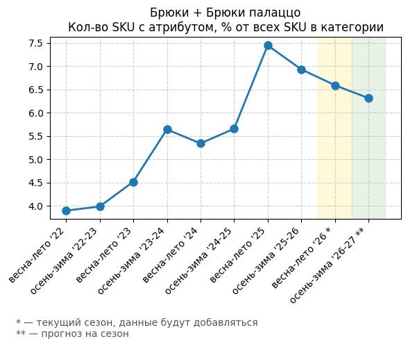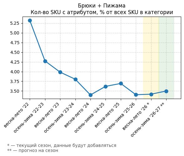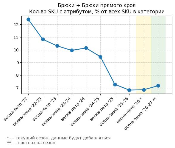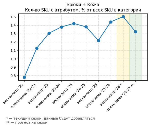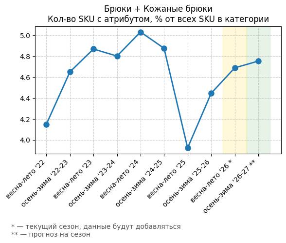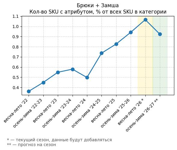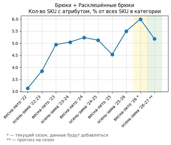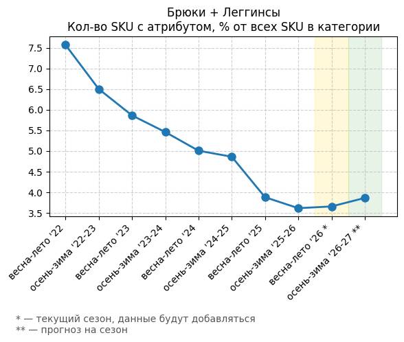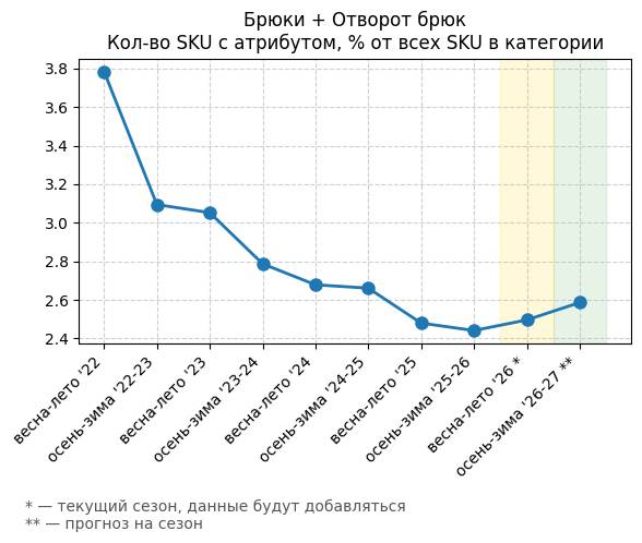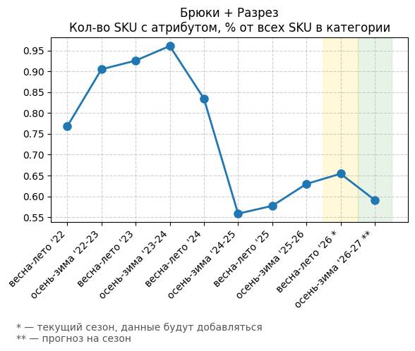 Брюки + Разрез - Кол-во SKU с атрибутом, % от всех SKU в категории