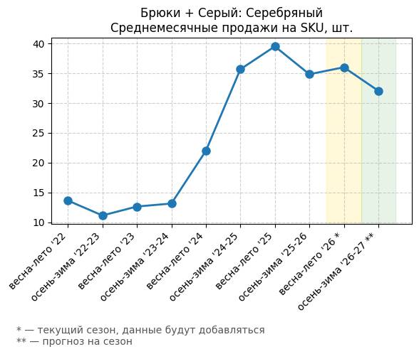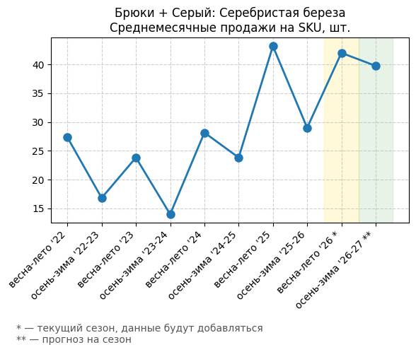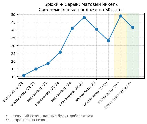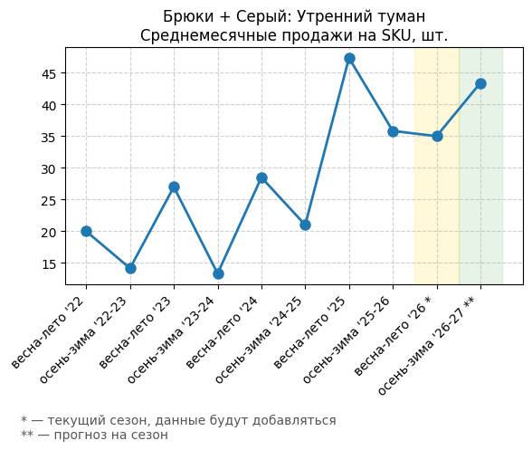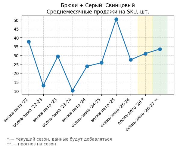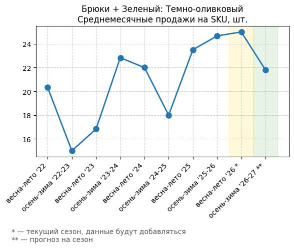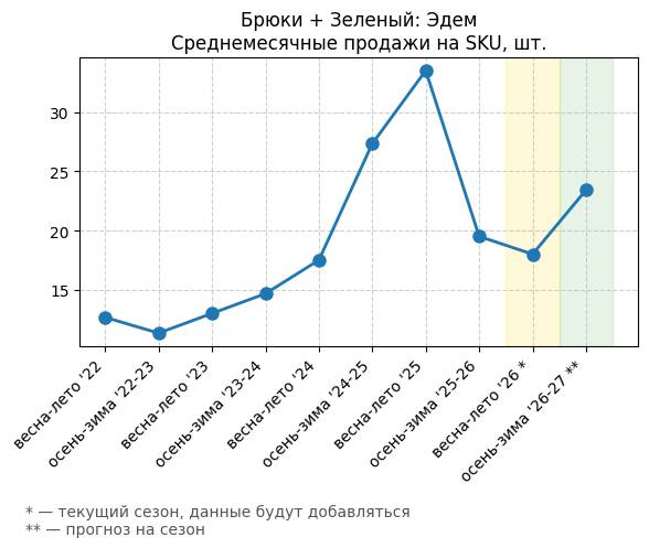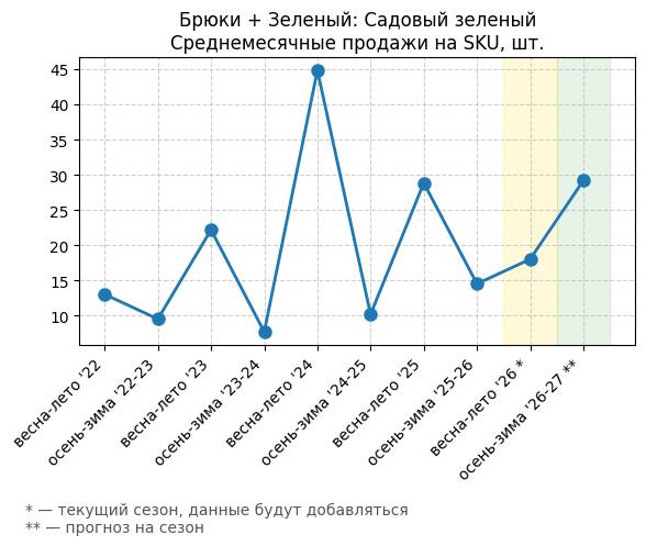 Брюки + Зеленый: Садовый зеленый - Среднемесячные продажи на SKU, шт.