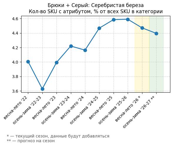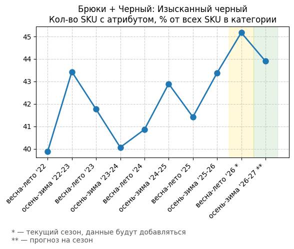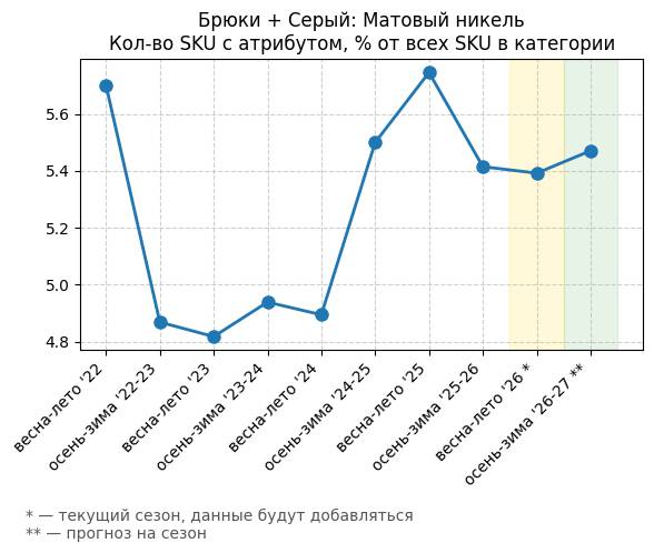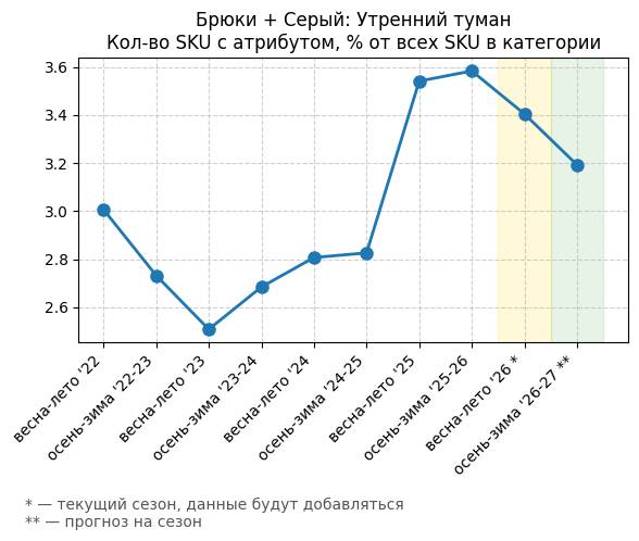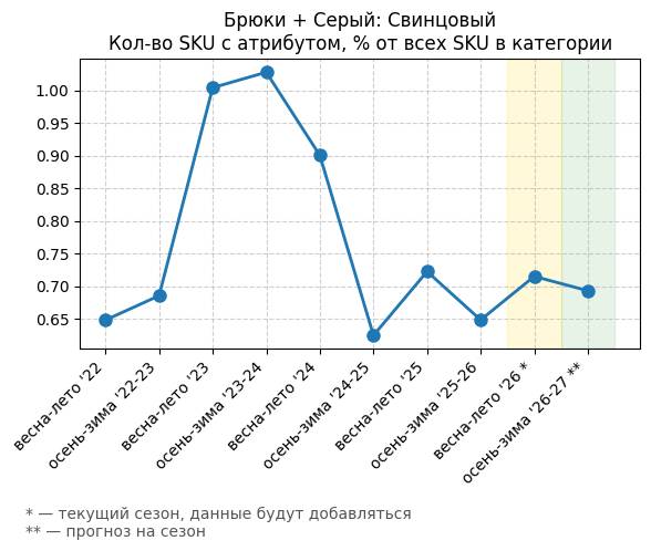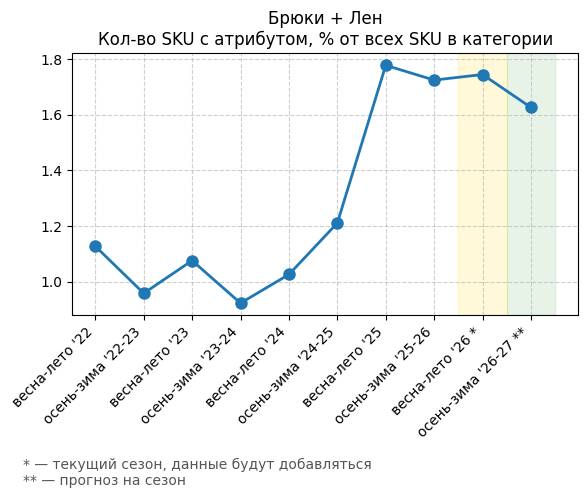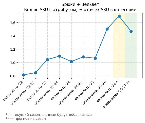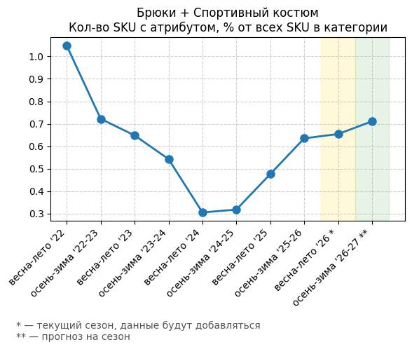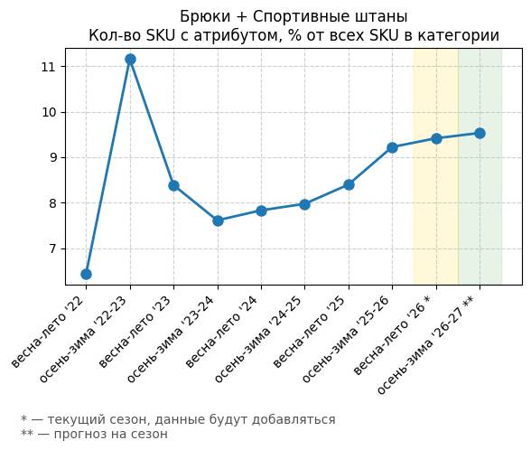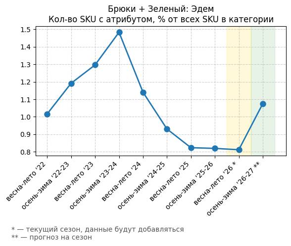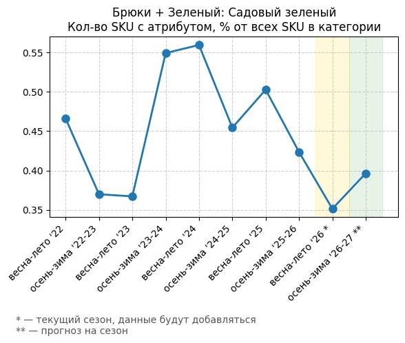 Брюки + Зеленый: Садовый зеленый - Кол-во SKU с атрибутом, % от всех SKU в категории