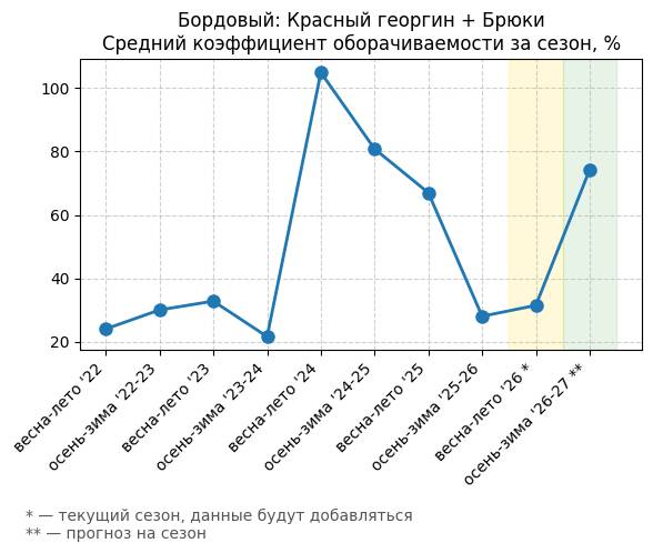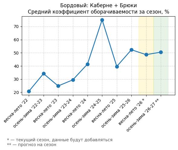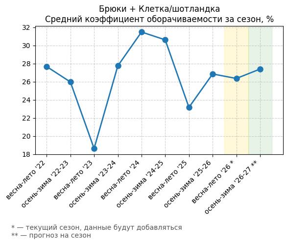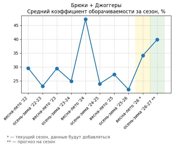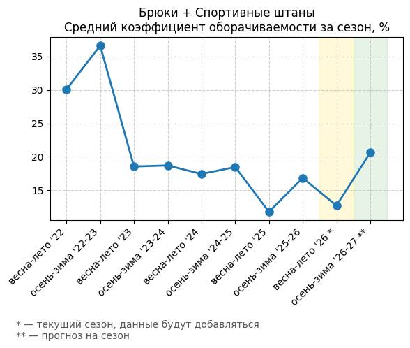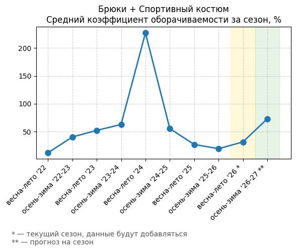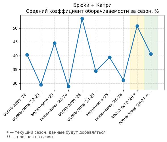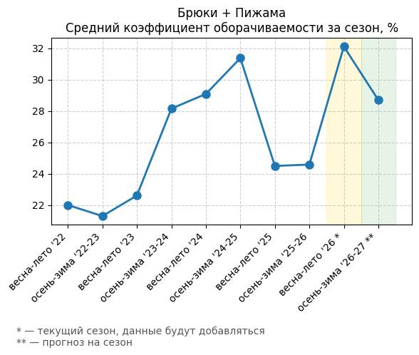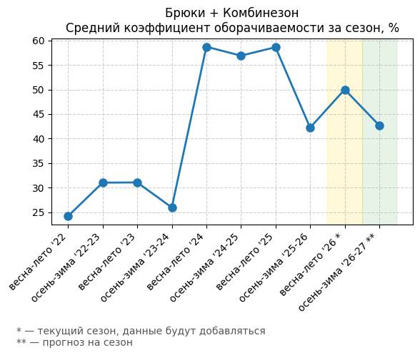 Брюки + Комбинезон - Средний коэффициент оборачиваемости за сезон, %