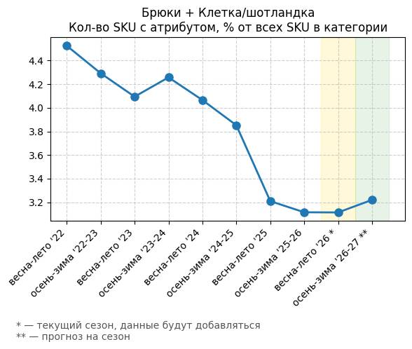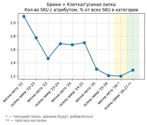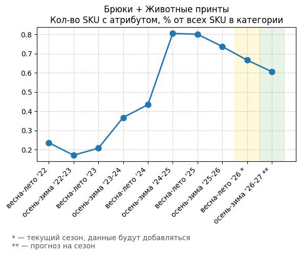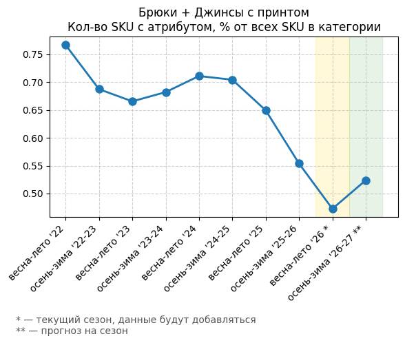 Брюки + Джинсы с принтом - Кол-во SKU с атрибутом, % от всех SKU в категории