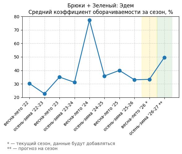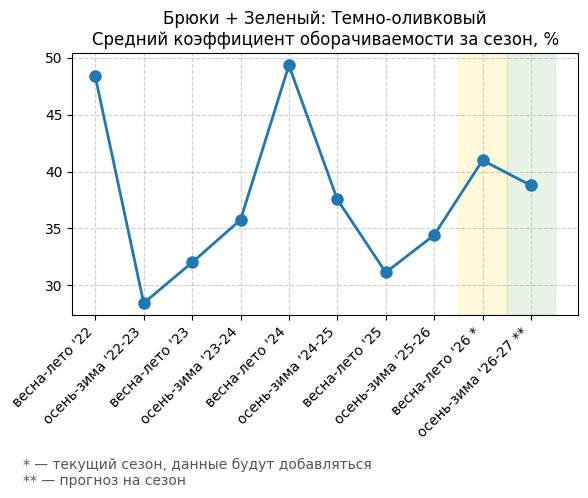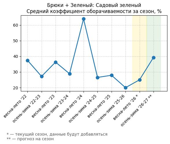 Брюки + Зеленый: Садовый зеленый - Средний коэффициент оборачиваемости за сезон, %