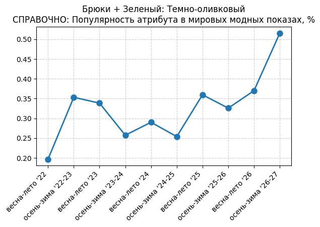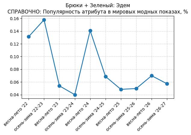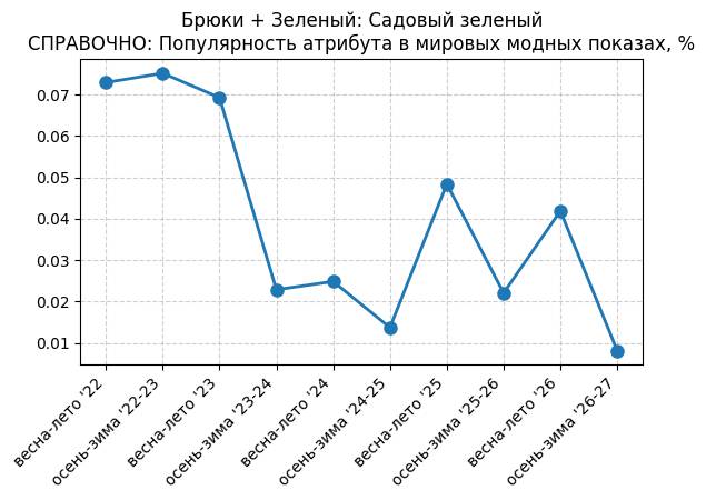 Брюки + Зеленый: Садовый зеленый - СПРАВОЧНО: Популярность атрибута в мировых модных показах, %