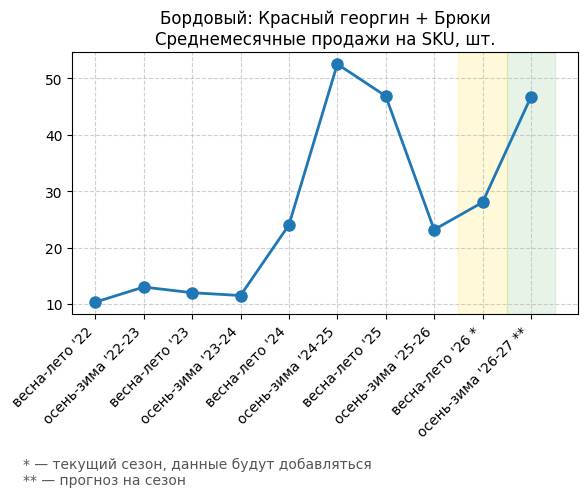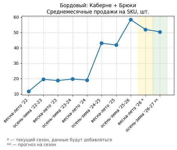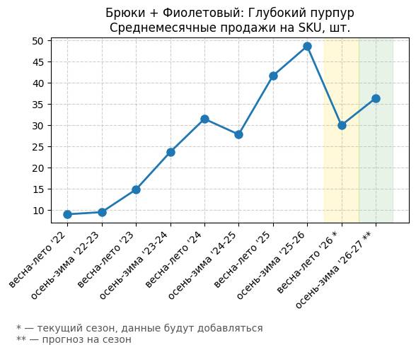 Брюки + Фиолетовый: Глубокий пурпур - Среднемесячные продажи на SKU, шт.