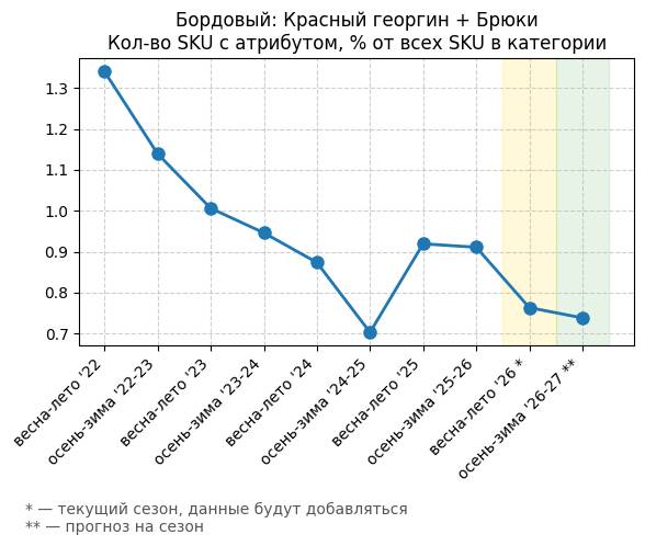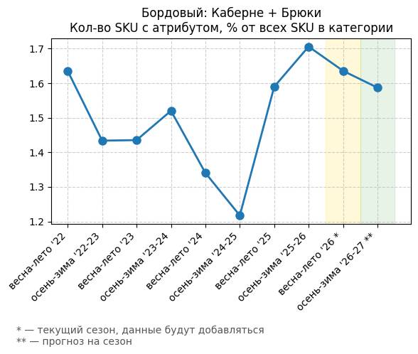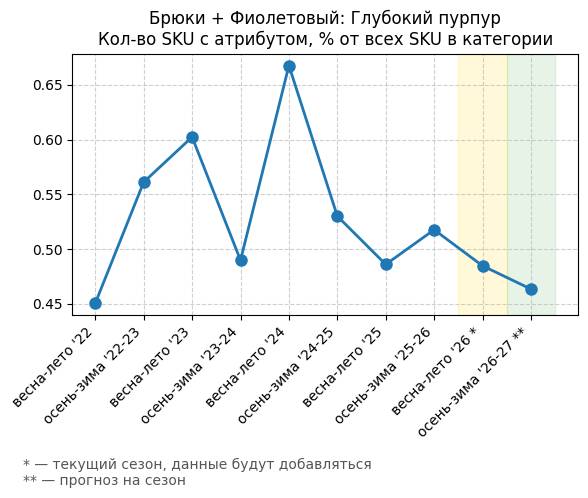 Брюки + Фиолетовый: Глубокий пурпур - Кол-во SKU с атрибутом, % от всех SKU в категории