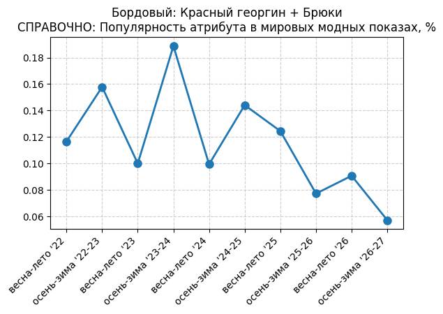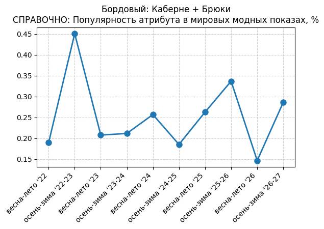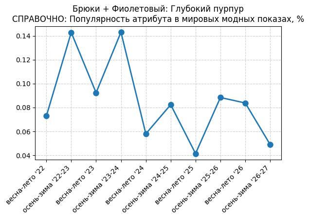Брюки + Фиолетовый: Глубокий пурпур - СПРАВОЧНО: Популярность атрибута в мировых модных показах, %