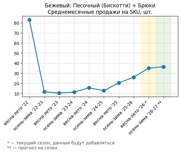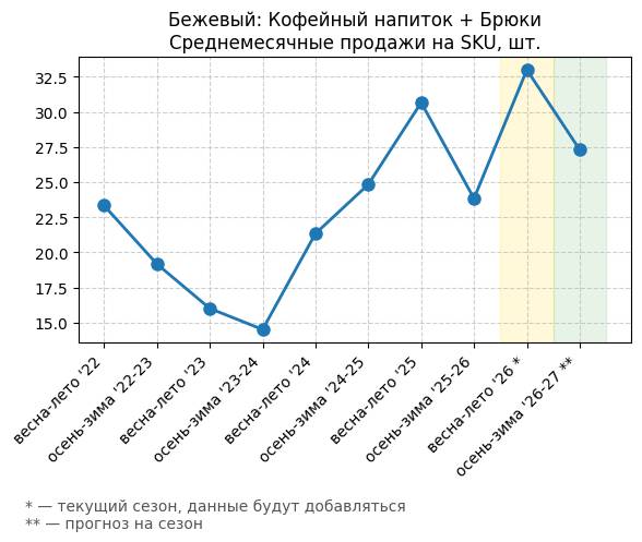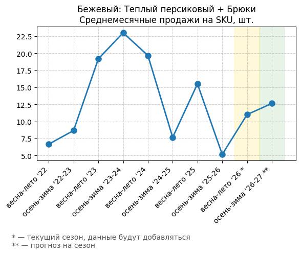 Бежевый: Теплый персиковый + Брюки - Среднемесячные продажи на SKU, шт.