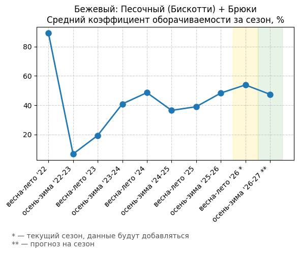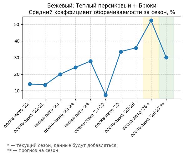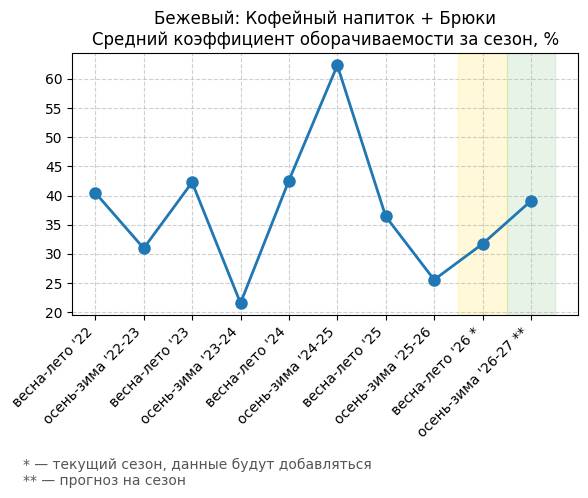 Бежевый: Теплый персиковый + Брюки - Средний коэффициент оборачиваемости за сезон, %