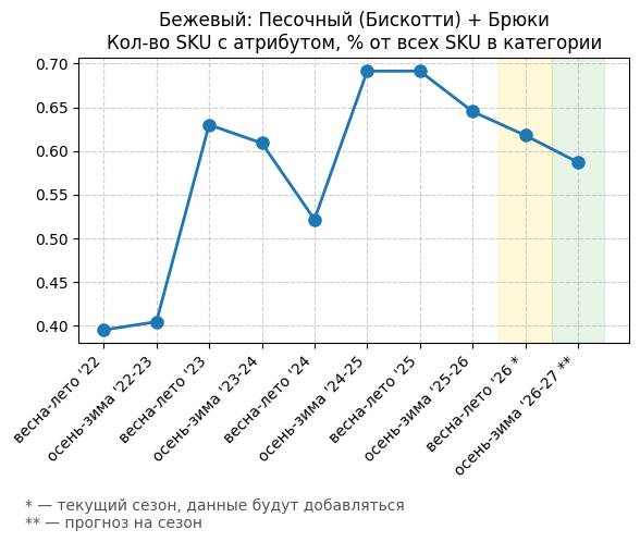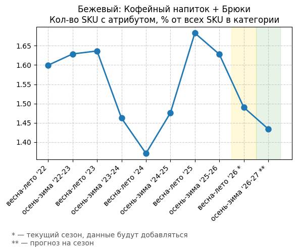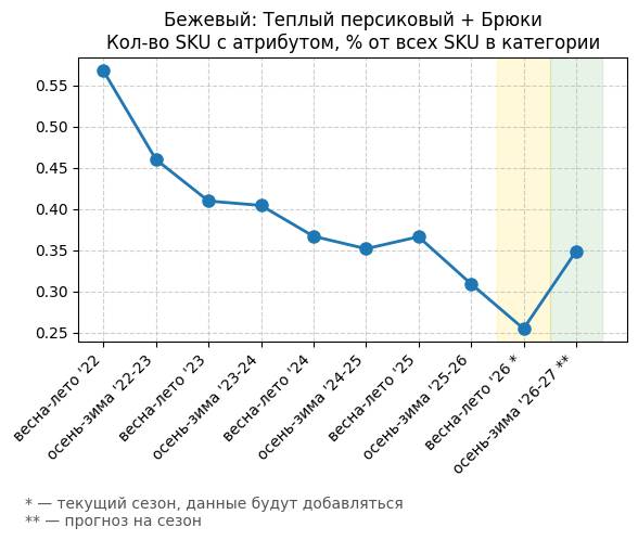 Бежевый: Теплый персиковый + Брюки - Кол-во SKU с атрибутом, % от всех SKU в категории