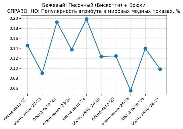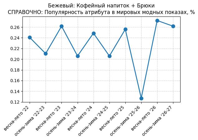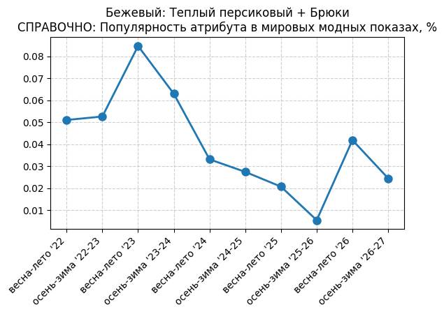 Бежевый: Теплый персиковый + Брюки - СПРАВОЧНО: Популярность атрибута в мировых модных показах, %