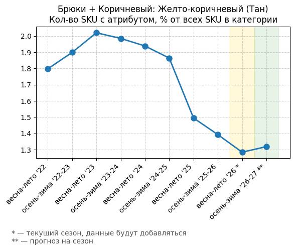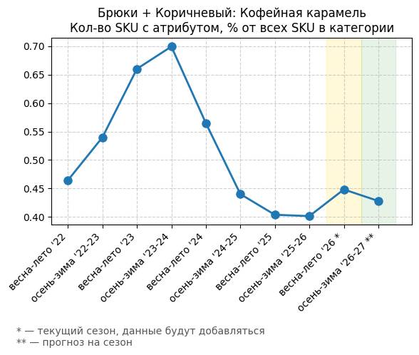 Брюки + Коричневый: Кофейная карамель - Кол-во SKU с атрибутом, % от всех SKU в категории
