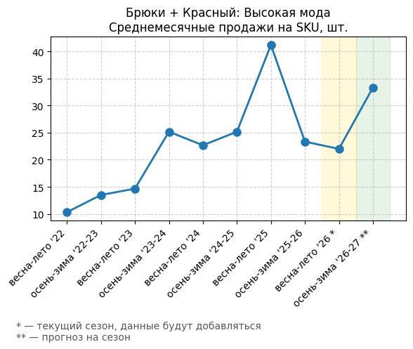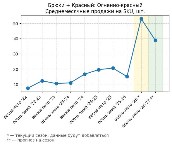 Брюки + Красный: Огненно-красный - Среднемесячные продажи на SKU, шт.