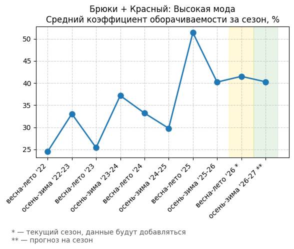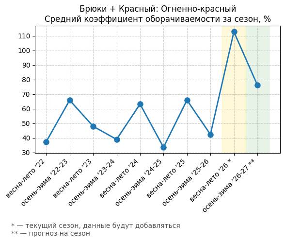 Брюки + Красный: Огненно-красный - Средний коэффициент оборачиваемости за сезон, %