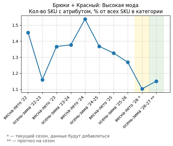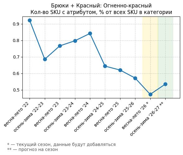 Брюки + Красный: Огненно-красный - Кол-во SKU с атрибутом, % от всех SKU в категории