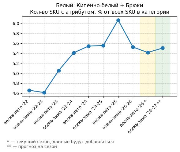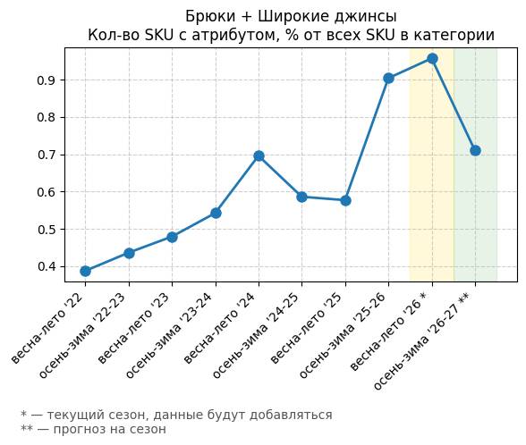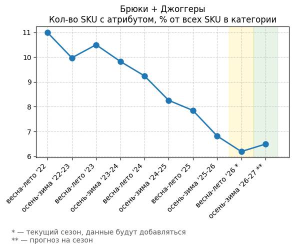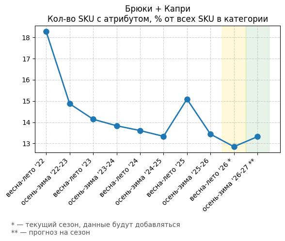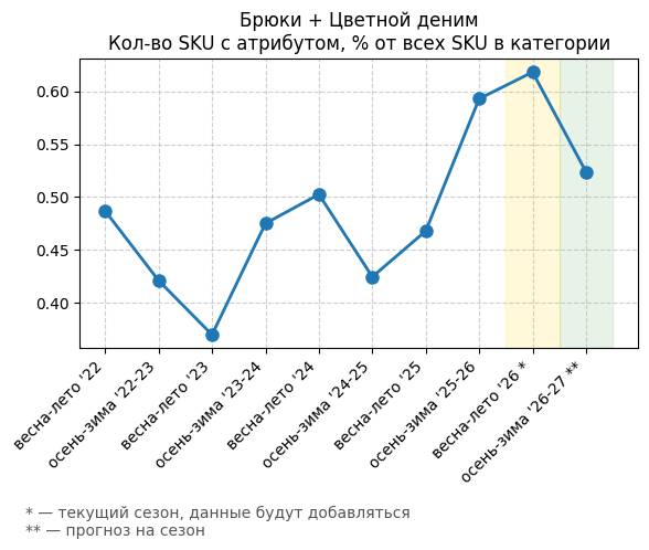Брюки + Цветной деним - Кол-во SKU с атрибутом, % от всех SKU в категории
