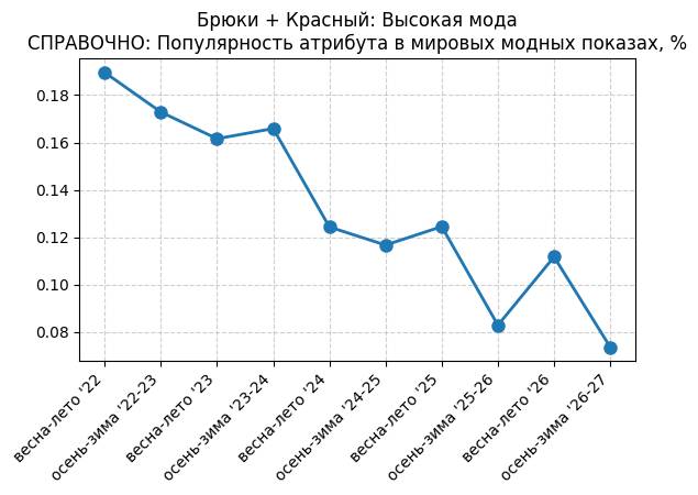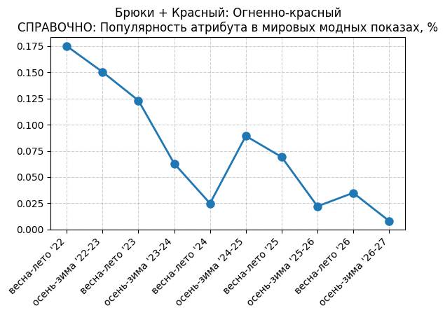 Брюки + Красный: Огненно-красный - СПРАВОЧНО: Популярность атрибута в мировых модных показах, %