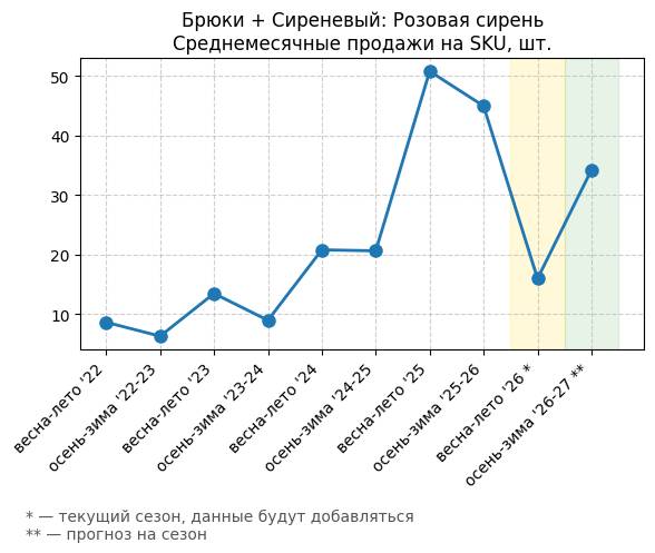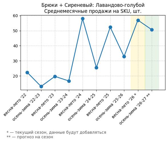 Брюки + Сиреневый: Розовая сирень - Среднемесячные продажи на SKU, шт.