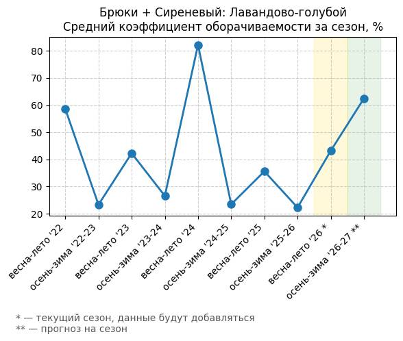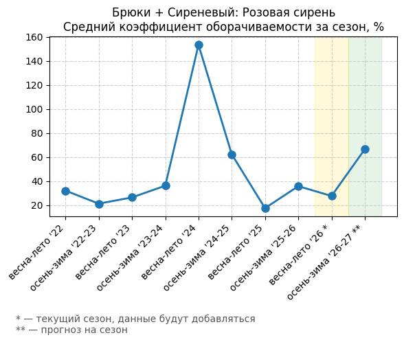 Брюки + Сиреневый: Розовая сирень - Средний коэффициент оборачиваемости за сезон, %