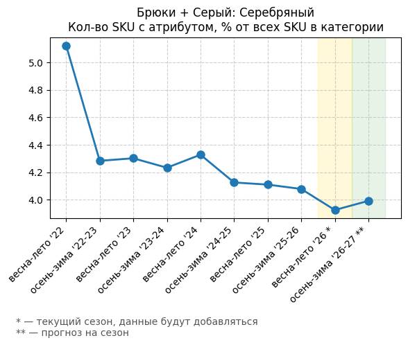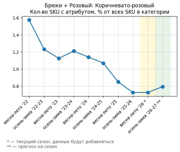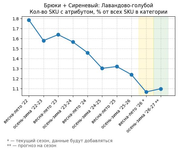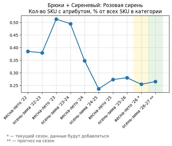 Брюки + Сиреневый: Розовая сирень - Кол-во SKU с атрибутом, % от всех SKU в категории
