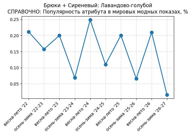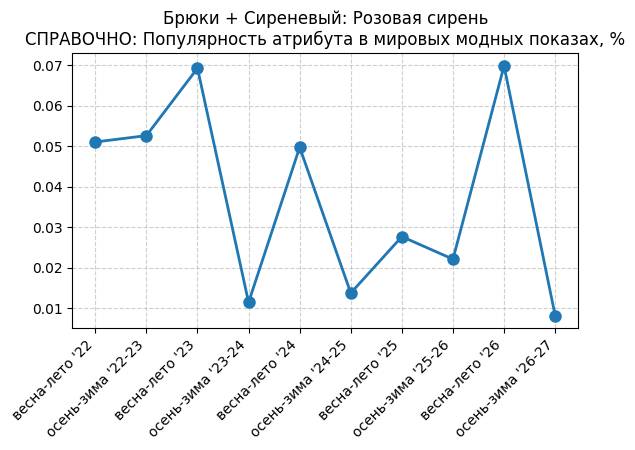 Брюки + Сиреневый: Розовая сирень - СПРАВОЧНО: Популярность атрибута в мировых модных показах, %